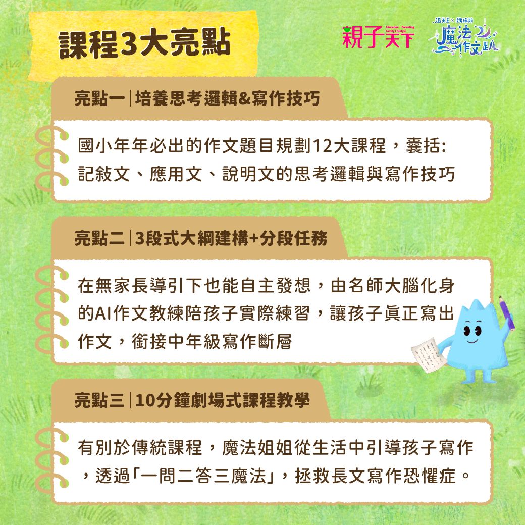 專為國小生設計的作文線上課程,由溫美玉X魏瑛娟老師親自訓練、打造的AI作文教練,一問一答引導孩子獨立寫出作文,培養孩子銜接中年級寫作斷層、拯救長文寫作恐懼症!