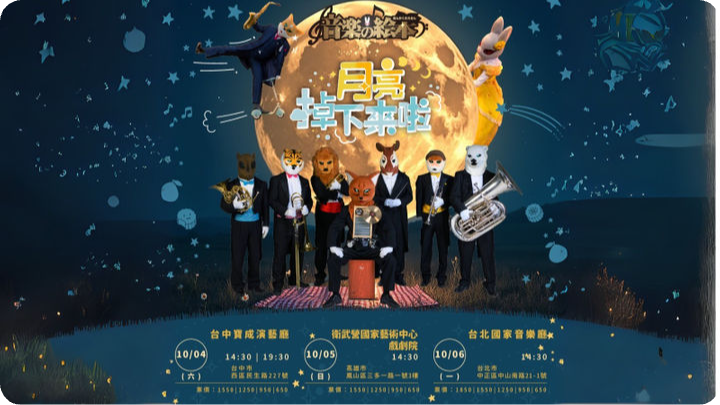今年中秋不一樣!別再只是吃月餅、戴柚子皮帽,帶孩子一起參加一場笑聲不斷、節奏滿滿的親子音樂會吧!由超人氣動物樂團領銜演出,最帥氣的銅管兄弟,將聯手靈巧鋼琴兔貝茲、迷人薩克斯狐狸拉度、以及活潑的擊樂豺,一起用音樂打造最奇幻的月夜冒險。 來自日本爆紅親子音樂節目「音樂的繪本.動物樂團」,在日本每年演出超過百場,場場爆滿、口碑爆棚,台灣巡演更已感動超過10萬觀眾,堪稱親子界每年必看之選! 今年以主題《月亮掉下來啦!》登場,節目中將演奏多首與月亮相關的經典曲目,包括爵士名曲〈How High the Moon〉、溫柔動人的〈Moon River〉等,用旋律帶領觀眾穿越雲端、漫步月光下,現場不只有動聽音樂,更充滿歡樂互動,孩子們不只是觀眾,更是冒險的參與者。今年中秋,就讓動物音樂家們陪你團圓,在音符中度過一個最潮、最萌、最有聲有色的音樂饗宴吧!