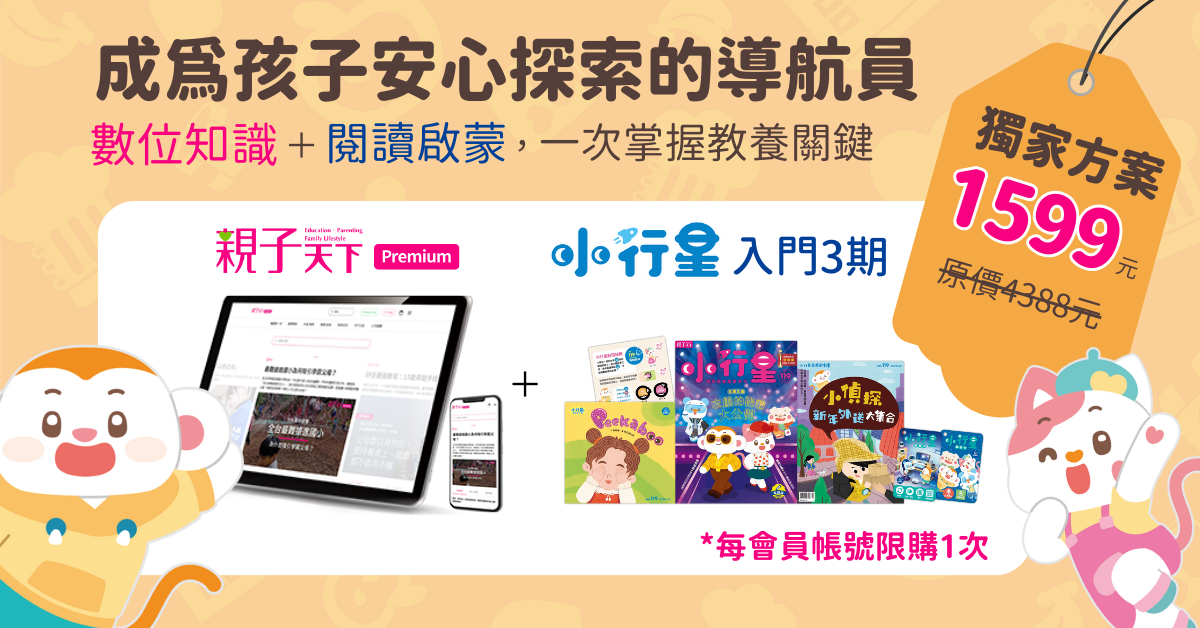 家長享有一年的Premium獨享權益 還可以陪孩子閱讀小行星幼兒誌 體驗優惠價1599元(36折),親子共讀無價!