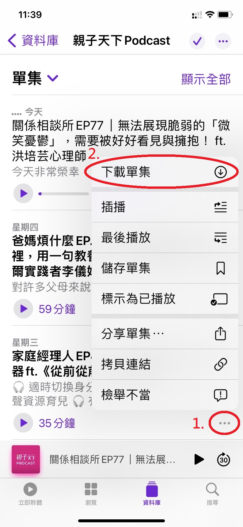 在Podcast APP中點擊異常集數右邊三個點,在跳出的功能表中點選【下載單集】,重新下載音檔。