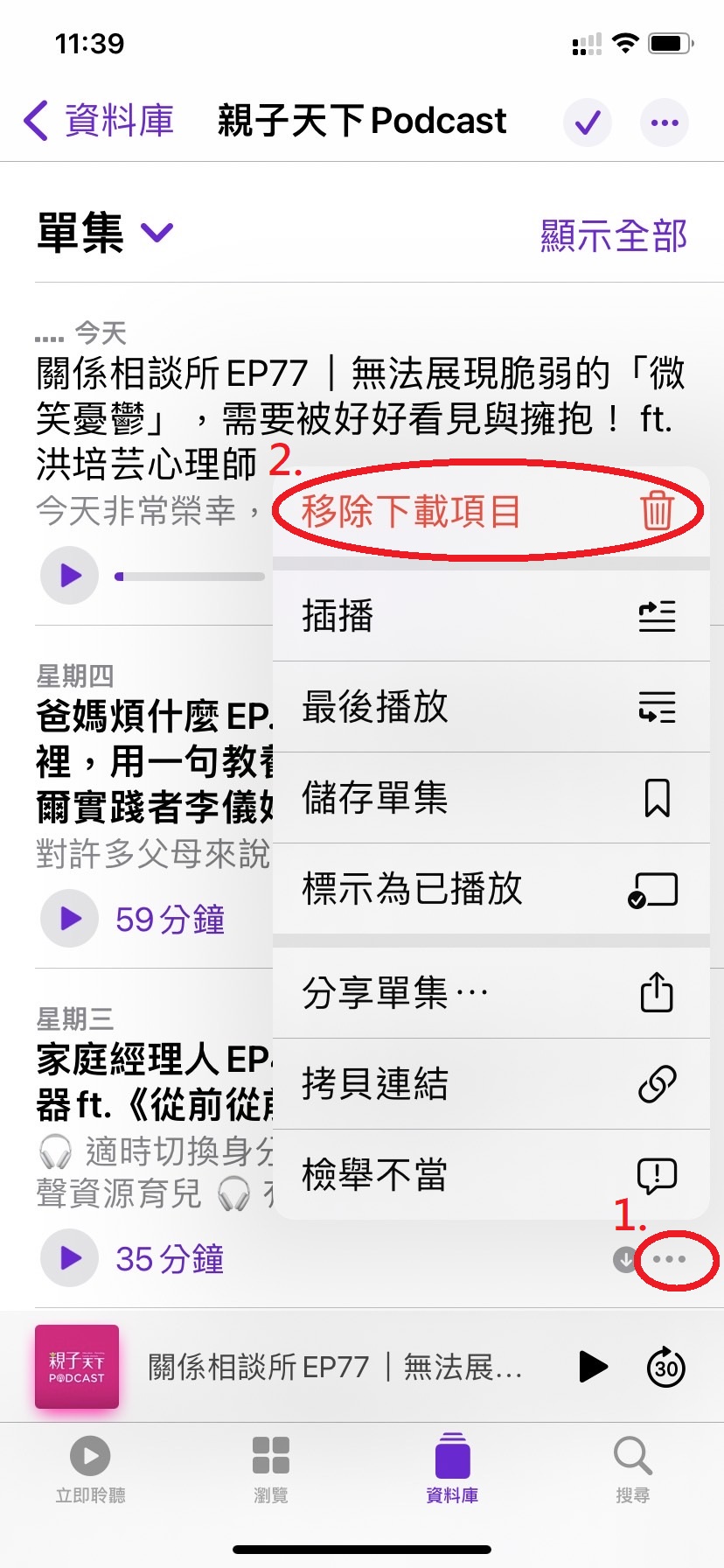 進入Podcast APP,點擊異常集數右邊三個點,在跳出的功能表中點選【移除下載項目】。