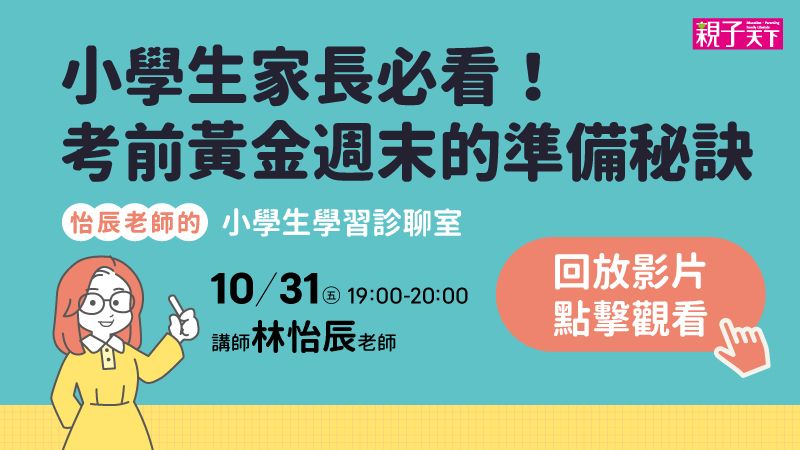 孩子考前衝刺期俗稱家長焦慮週,我們特別邀請林怡辰老師來分享——《怡辰老師的小學生學習診聊室》中提及的關鍵策略,幫助孩子在「黃金週末」穩健備考。歡迎小學生家長上線聽講!