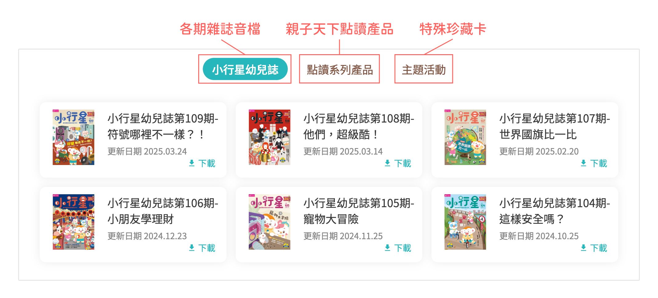 51期(含)之後的小行星點讀筆為可擴充音檔的產品,內建基本音檔為《唱兒歌、學注音》、《聽故事玩語文》、《吳敏蘭陪小孩聽英文童話》、《識字100》,其他版品音檔,無內建請自行下載。