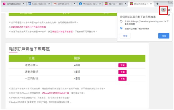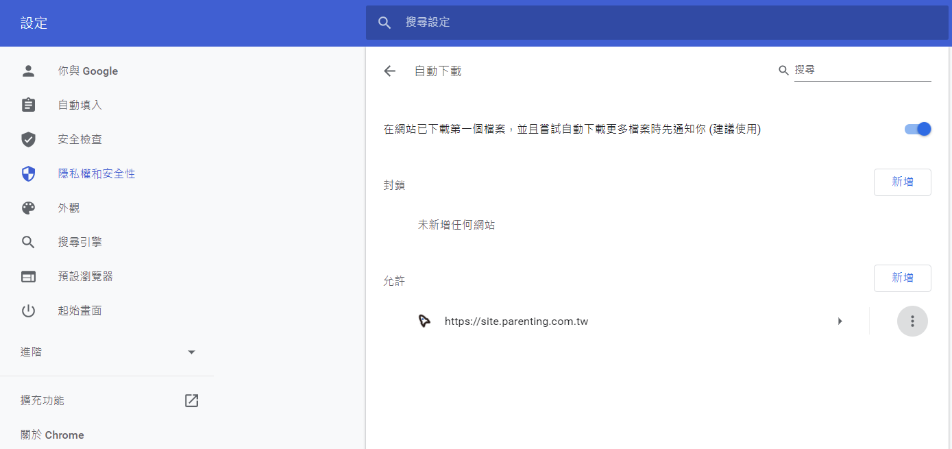 若頁面沒有出來,設定的路徑是-   Chrome的設定->進階->隱私權與安全性->網站設定->自動下載 。
