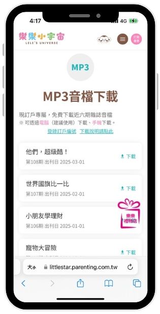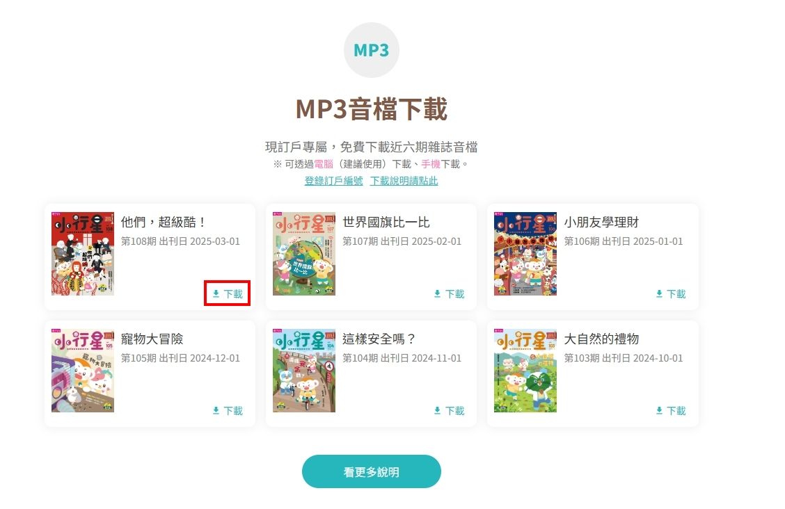 (2) 故事MP3下載(當前訂戶專屬,需先綁定訂戶編號):可下載距今近6期雜誌故事音檔,導入USB、電腦、手機、MP3播放器等,提供家長更彈性地選擇播放裝置。更多說明可參考關於MP3音檔下載。