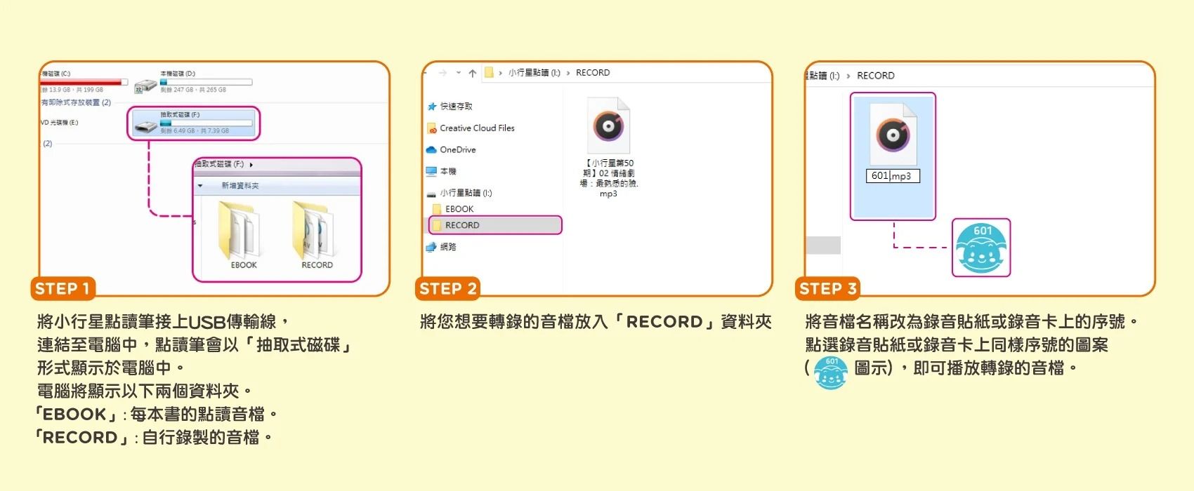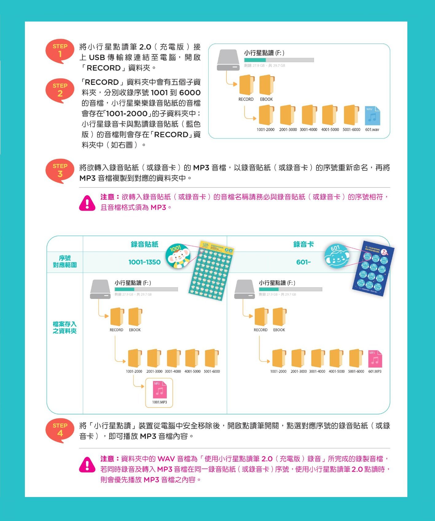 注意:若是使用樂樂錄音貼紙備份的音檔,需對照「RECORD」每個子資料夾中的數字,分別存回點讀筆中「RECORD」對應數字的子資料夾中,即可進行點讀。