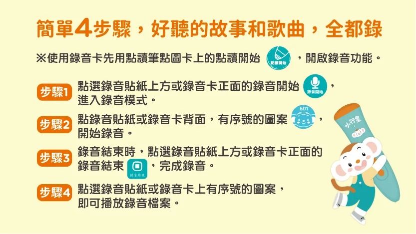 小行星點讀筆的錄音功能需要搭配雜誌內的「錄音卡」或小行星出版之「錄音貼紙」方能使用,詳細錄音方式和步驟請參考下一題回應。