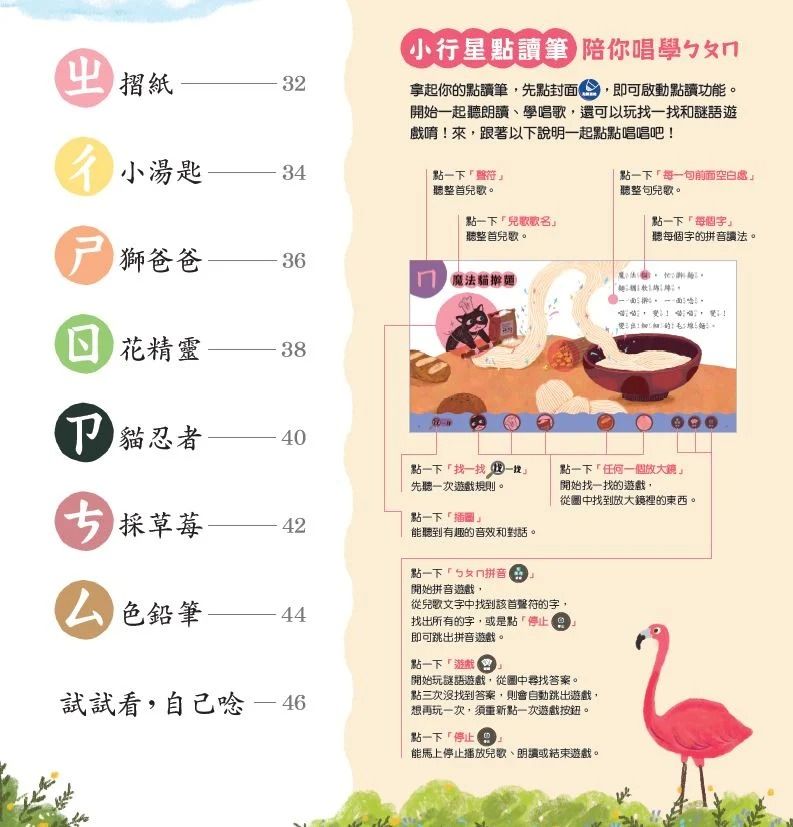 因應產品的使用情境與適用年紀,各項產品的點讀規劃也會有差異。為方便家長快速理解、上手,每一套產品的內頁目錄或使用手冊中均會清楚說明該套產品的點讀技巧,方便家長引導孩子點讀,增加更多互動學習。
