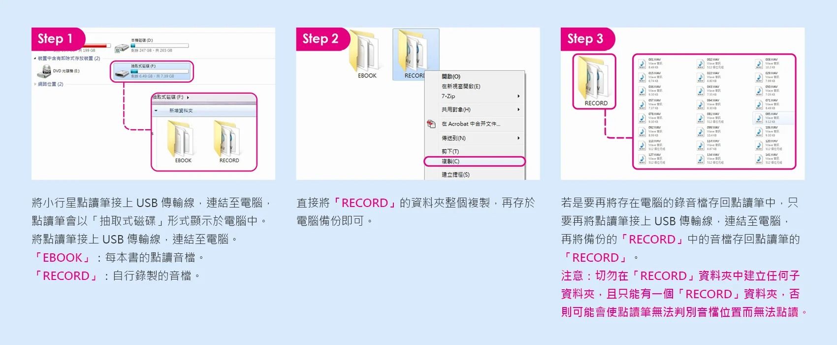 若是要將存在電腦的錄音檔存回點讀筆中,只要再將點讀筆接上USB傳輸線,連結至電腦,再將備份的「RECORD」中的音檔存回點讀筆中的「RECORD」。