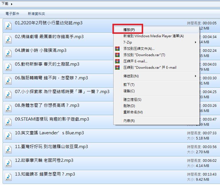 因應不同使用者會有單首播放或播放順序調整的需求,所以我們提供當期故事音檔單首下載的服務,讓您在專輯播放運用上更加自由。若您有專輯循環播放的需求,目前市面上有許多相關應用的app可支援。附上相關操作,僅供參考:選取要播放的曲目,按右鍵點選"播放"