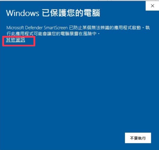 Windows 10以上的電腦,本身會內建防毒軟體,故第一次執行從網路下載的程式時,系統本身會產生預設的保護動作,當以上訊息出現時請點開 "其他資訊"並按下允許一次後,就可以下載了 。