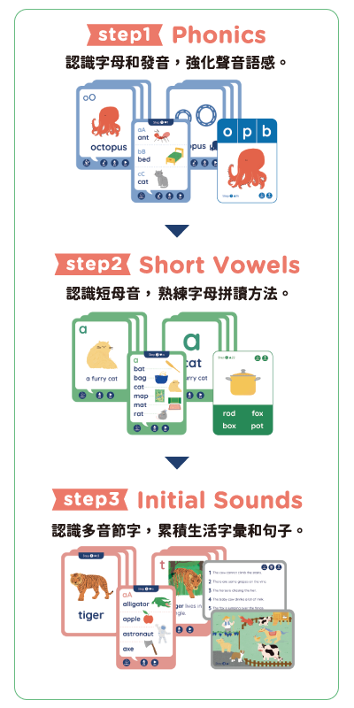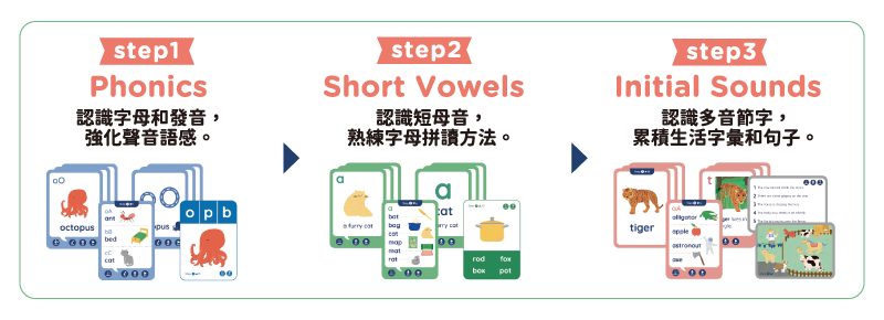 如果孩子從小就能啟動對聲音的辨識能力,那不管母語或外語的學習,都一定能事半功倍,這也是產品特別強調音節拆解&語感養成的原因,從這套產品開始,讓孩子聽到英文的音素聲音。