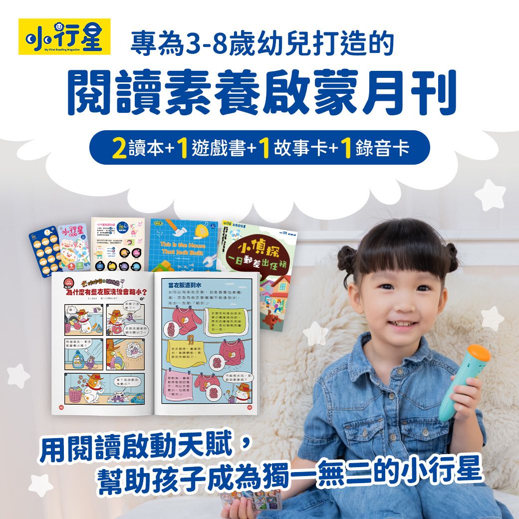 《小行星幼兒誌》是針對3-6歲孩子全方位打造的閱讀啟蒙刊物,訂閱即享有多元閱讀素材,包含故事讀本、創意遊戲書、點讀ABC,定期定量幫助孩子培養閱讀習慣。
