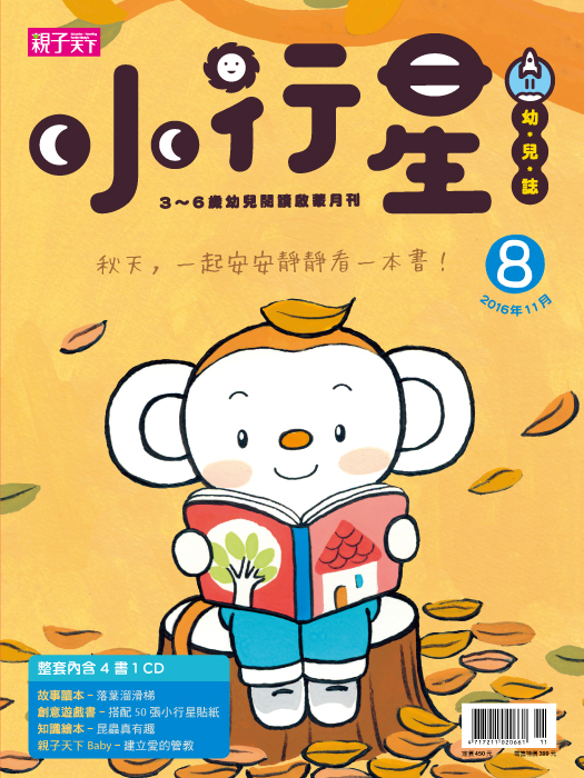 十一月,你有發現生活周遭有了哪些明顯的變化嗎?天氣一天天轉涼,衣服愈穿愈厚,路旁的樹冠變單薄,公園裡的落葉變多,大地不再翠綠耀眼,取而代之,增添許多橘黃色調,如同本期《小行星幼兒誌》的封面,呈現出濃濃的秋天色彩。爸爸媽媽可以帶孩子像主角人物一樣,在室內或戶外選個舒適的角落,一起安安靜靜的看本最愛的書,來場心靈知性的對話,也許會有令人意想不到的收穫喔! 自本期起,《創意遊戲書》結合小行星四個主角人物,帶領孩子一起玩多元智能遊戲,從封面開始,一路玩到底,並搭配孩子最愛的貼紙連動遊戲,豐富玩法和提高內容的延展性,最重要的是,主題與孩子的生活經驗結合,在作答中,可引導孩子觀察留意自然景物的變化,讓學習與生活結合,觸發孩子生活感知的能力。