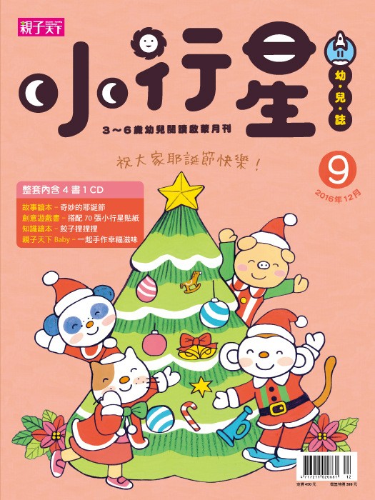你相信世界上真的有耶誕老公公嗎?你期待他駕著雪橇來送禮物嗎?在本期「故事讀本」中,有「奇妙的耶誕節」、「小精靈的耶誕禮物」、「呵呵呵!我是耶誕老公公」等關於耶誕老公公的故事,以及英文童謠「Star Light Star Bright」,要帶領小朋友進入閱讀的想像世界裡,學習體諒、感恩和回饋。 耶誕節,還會讓你聯想到什麼呢?這次要解開巧克力的祕密,邀請爸媽和孩子一起動手做巧克力薑餅人,也玩《餃子捏捏捏》的遊戲,或是參考《親子天下Baby》主題企劃,到親子烘焙友善店家,一起手作幸福的甜蜜滋味。 在迎接12月的到來,同時也準備送走2016年。回想過去的這一年,你的願望都實現了嗎?面對新的一年,你有哪些新的期待呢?希望所有小朋友的夢想都能成真喔!