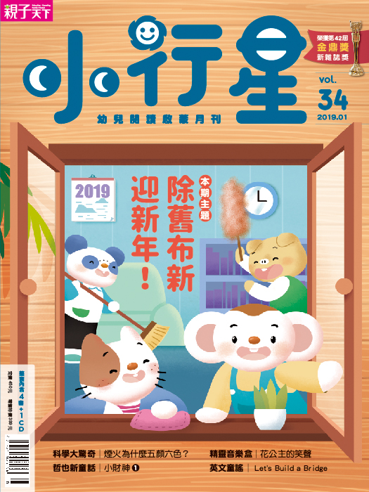 時間過得好快,一轉眼已經跨入2019年,回顧過去,展望新年,大小讀者們是否也在新年的開始,給自己許一個新的願望呢?本期《小行星幼兒誌》以「除舊布新,迎新年!」為題,邀請大家在農曆歲末時,來場大掃除。面對每天生活的環境,要怎麼清潔和整理?用不到的東西,哪些可以資源回收?回收物又會跑去哪裡呢?大家在忙著大掃除之餘,也能一起討論這些問題,培養環保意識,增加生活趣味喔!