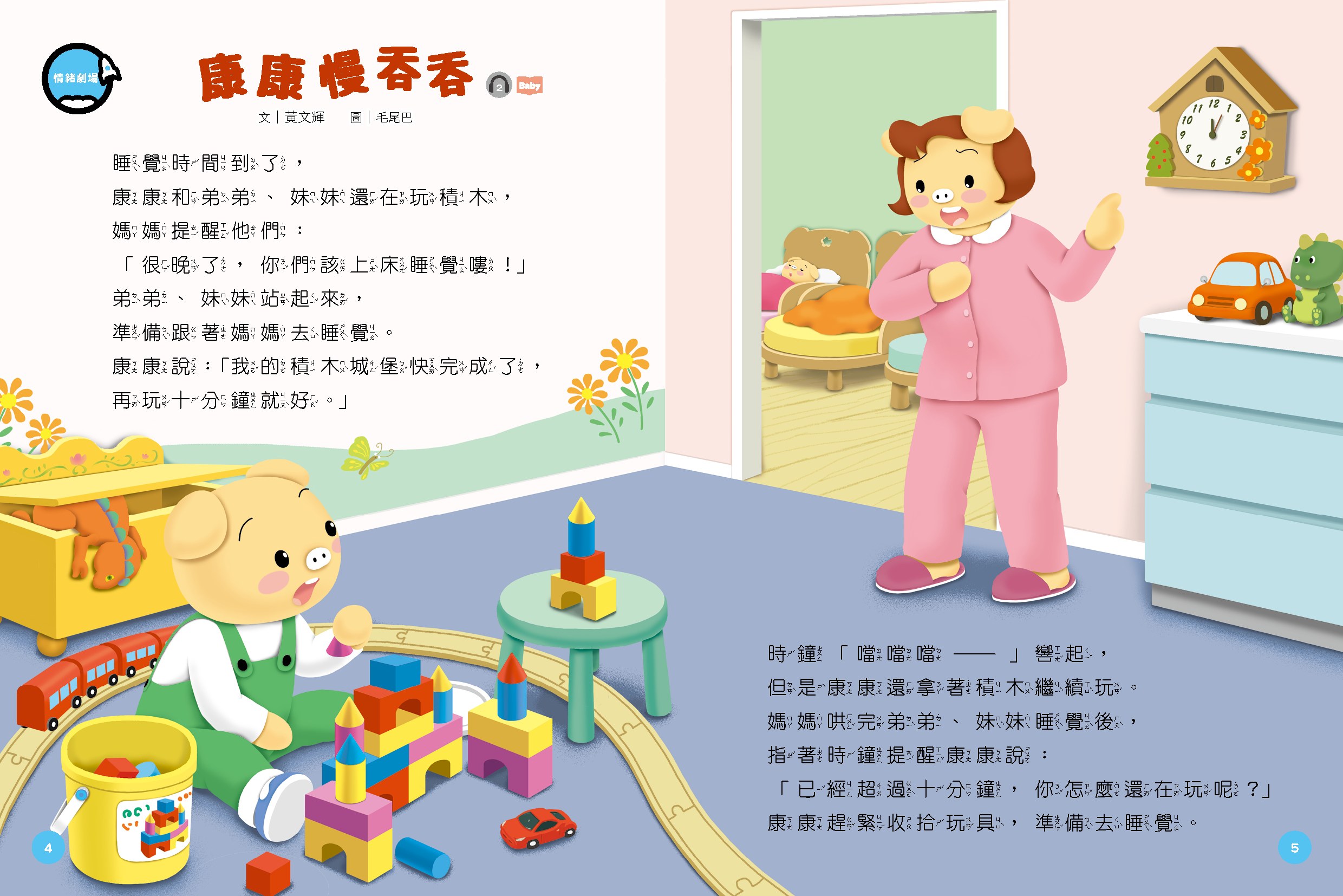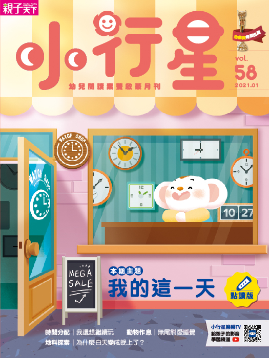 1月是新年的開始,今年和孩子訂定的新目標是什麼呢?如果想達成目標,學會有效的時間管理更顯得重要喔!「時間」雖然是抽象概念,但對孩子來說並不困難,透過日常的生活作息,觀察一天的從早到晚的變化,很容易就能理解。本月《小行星幼兒誌》特別以「我的這一天」為重點主題,先帶孩子認識時間,有了基礎觀念後,就可以進一步學習如何分配及運用時間。只要一點一滴累積,達成目標便指日可待!還有小行星點讀ABC系列《Are You Sleeping?》,每天早上聽到鬧鐘鈴響,孩子會迫不急待的起床迎接美好的早晨嗎?還是會像小瞌睡蟲想再多睡一會呢?藉由本期的故事及遊戲,邊玩邊學看時鐘的方法,並認識實用的時間相關詞語吧!