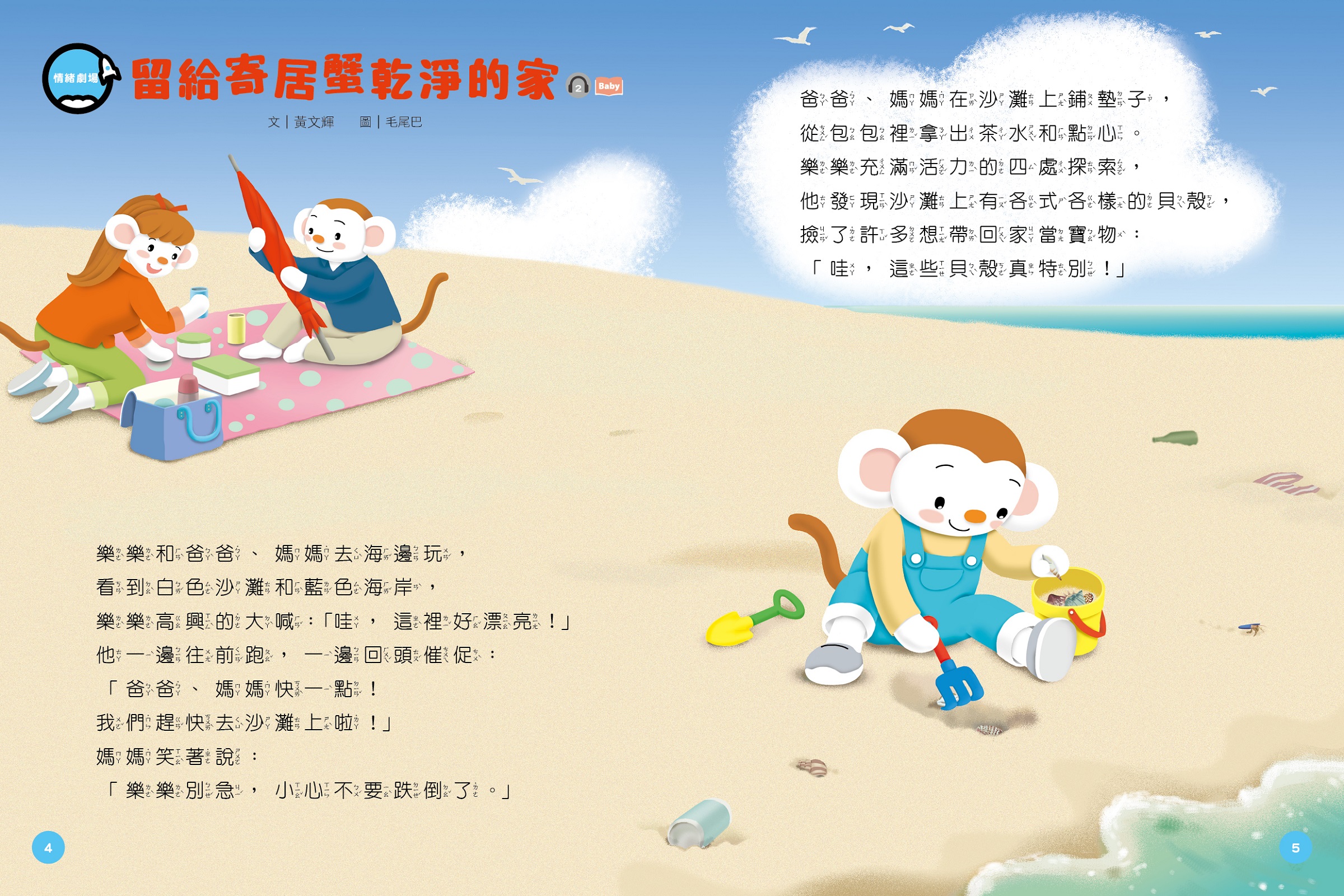 本期重點單元包括〈知識不思議〉、〈情緒劇場〉,帶孩子了解環保的重要性。還有小兒感染科醫師黃瑽寧專欄「手被門夾到了」、科普教育專家胡妙芬的「海上為什麼有電風扇?」,以及兒童文學作家劉思源所寫「一二三,木頭人」、游書珣的童話「小剪刀魚1」等精采的內容。