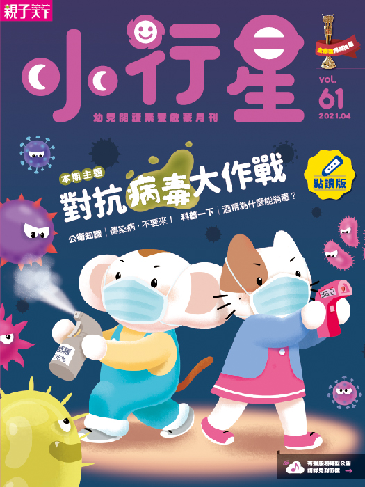 4月隨著春天的暖意到來,草木復甦,大地又添上了繽紛的色彩。不過這段時間容易乍暖還寒,流感、病毒伺機而動。雖然我們的肉眼看不見,病毒卻無所不在……本月《小行星幼兒誌》特別以「對抗病毒大作戰」為重點主題,帶孩子了解病毒、細菌的傳染途徑,也提供孩子建立良好衛生習慣的方法,降低病毒入侵體內的機率。還有小行星點讀ABC系列《Old MacDonald》,帶大家聽聽英文版的〈王老先生有塊地〉,一起到農場看看各種可愛的動物,認識牠們的相關單字;此外,農場裡還有個驚奇等大家一同來發現喔!