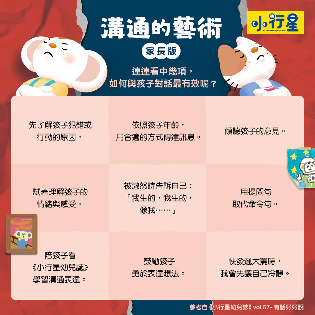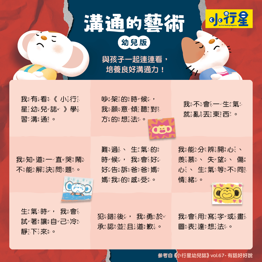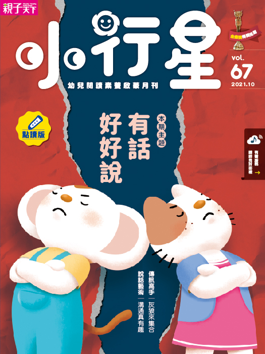 | 本月特別專題以「當孩子情緒來了,家長兩大迷思先轉念」,提供家長循序漸進的情緒教育方針,也提供小行星讀本的專欄作家延伸解說,讓家長輕鬆掌握每期教養和學習重點。 |