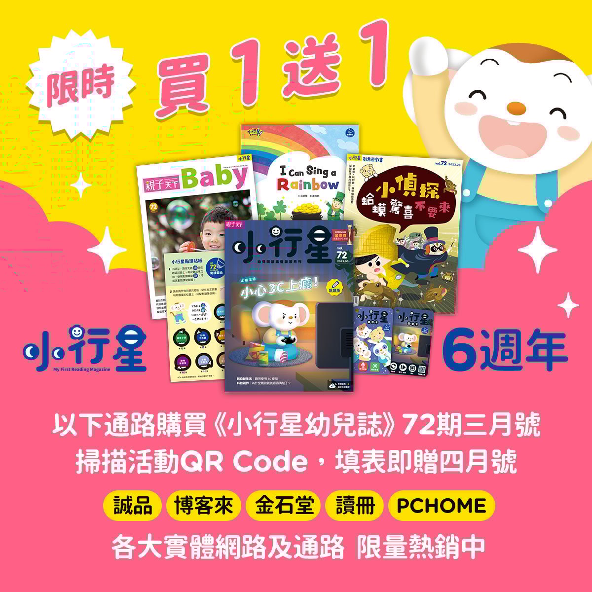 即日起至2022/3/25,至誠品、博客來、金石堂、讀冊、PCHOME等實體或網路通路,購買《小行星幼兒誌》72期,掃描活動QR Code,填表再送你一期!