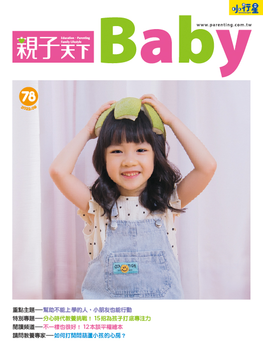 | 本月特別專題以「分心時代教養挑戰,15招為孩子打底專注力」,幫助師長有效的運用具體、實用方法,為學齡前孩子的專注力打好基礎,有助於適應未來的小學生活。每期《親子天下Baby》除了有豐富的教養資訊與知識,也將提供小行星讀本的專欄作家延伸解說,讓家長輕鬆掌握每期教養和學習重點。 |