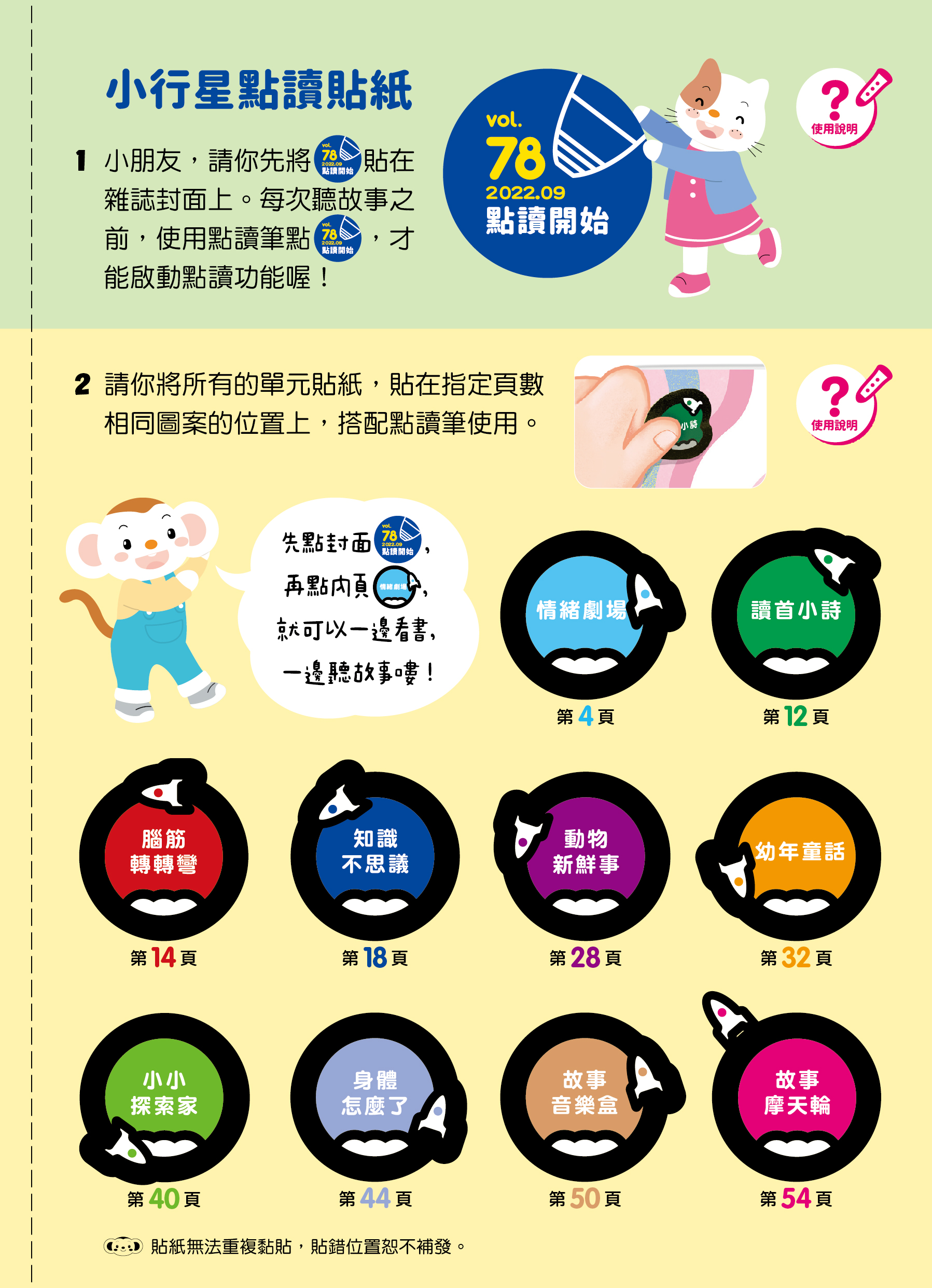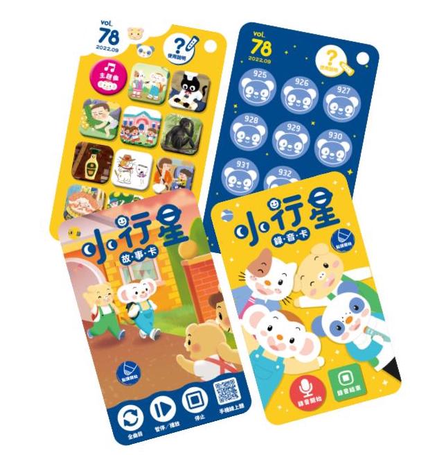 | 搭配小行星點讀筆使用。小行星故事卡具備全曲目播放、暫停/播放、完全停止功能鍵,並且完整收錄當期所有音檔,包括各單元完整曲目、小行星主題曲、《小行星點讀ABC》、小行星的祝福等。小行星錄音卡則有10多個錄音鈕,可供孩子重複錄製聲音,嘗試說故事或唱歌給自己或爸媽聽。
