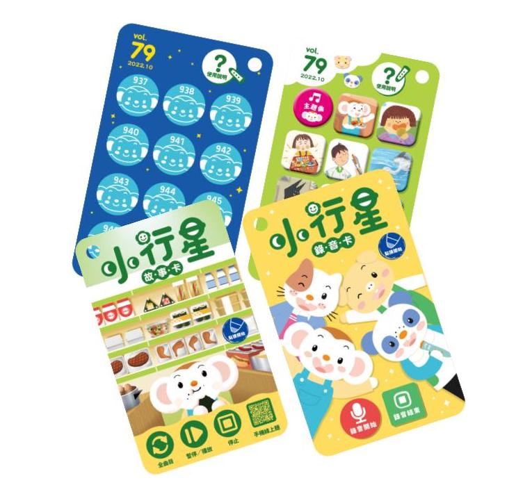 | 搭配小行星點讀筆使用。小行星故事卡具備全曲目播放、暫停/播放、完全停止功能鍵,並且完整收錄當期所有音檔,包括各單元完整曲目、小行星主題曲、《小行星點讀ABC》、小行星的祝福等。小行星錄音卡則有10多個錄音鈕,可供孩子重複錄製聲音,嘗試說故事或唱歌給自己或爸媽聽。