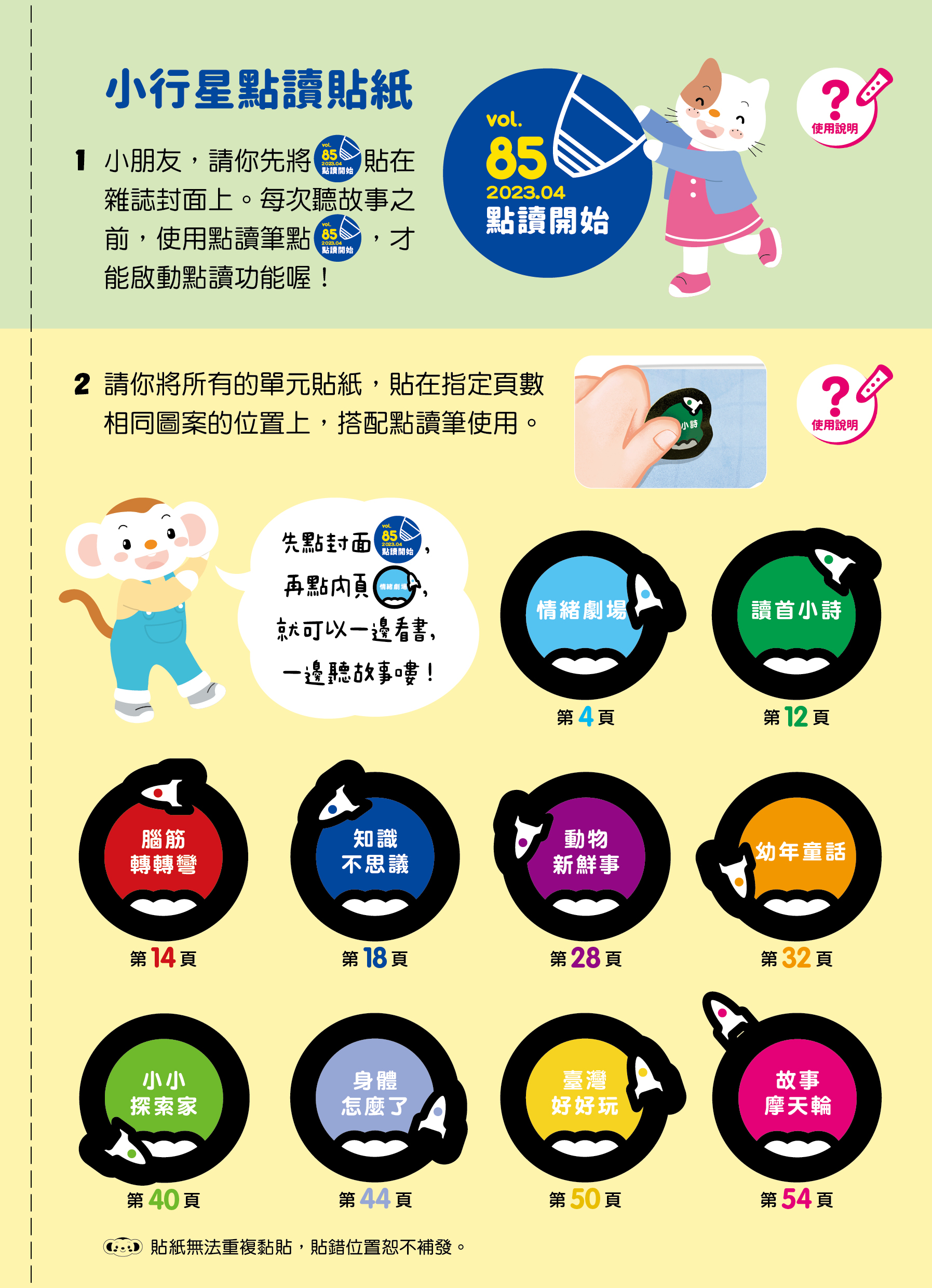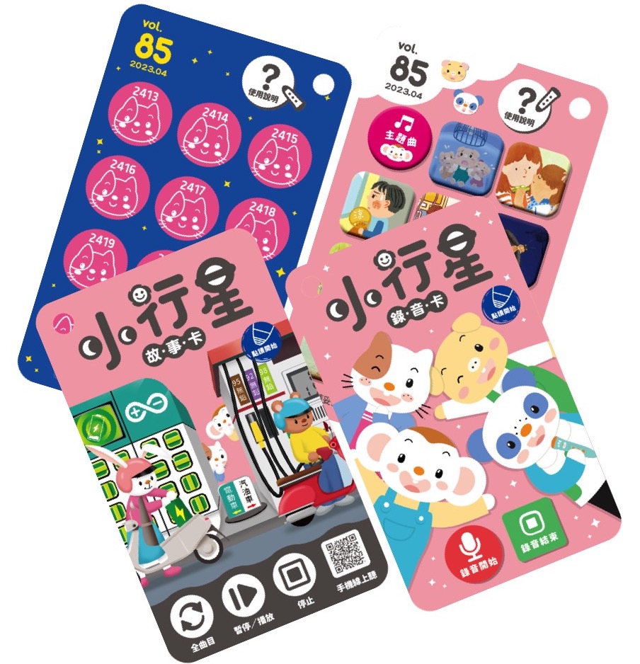 搭配小行星點讀筆使用。小行星故事卡具備全曲目播放、暫停/播放、完全停止功能鍵,並且完整收錄當期所有音檔,包括各單元完整曲目、小行星主題曲、《小行星點讀ABC》、小行星的祝福等。小行星錄音卡則有10多個錄音鈕,可供孩子重複錄製聲音,嘗試說故事或唱歌給自己或爸媽聽。 |