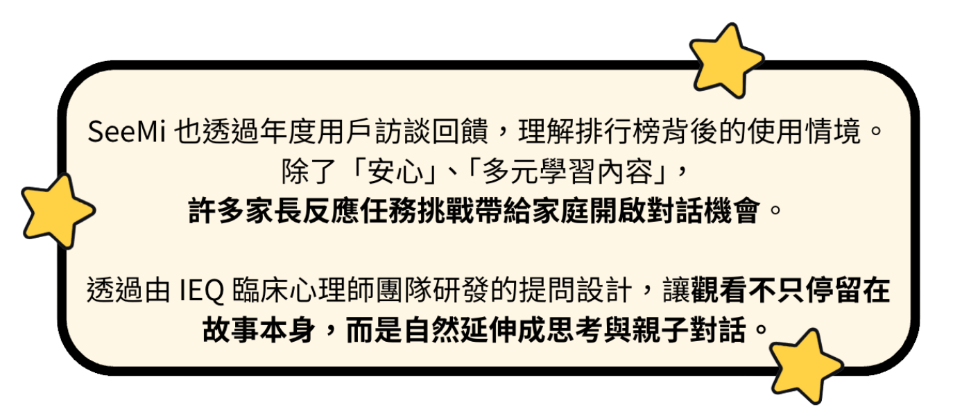 “有了SeeMi幫忙篩選過影片內容,家長可以放心,也適合孩子學習。”