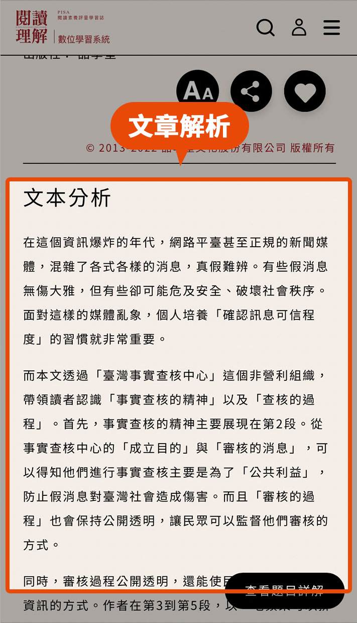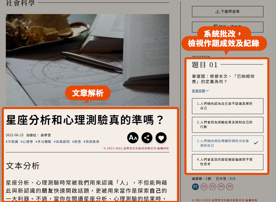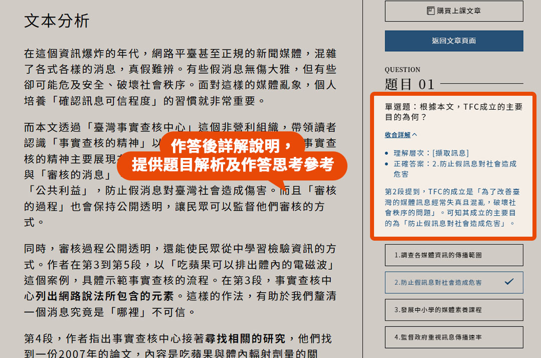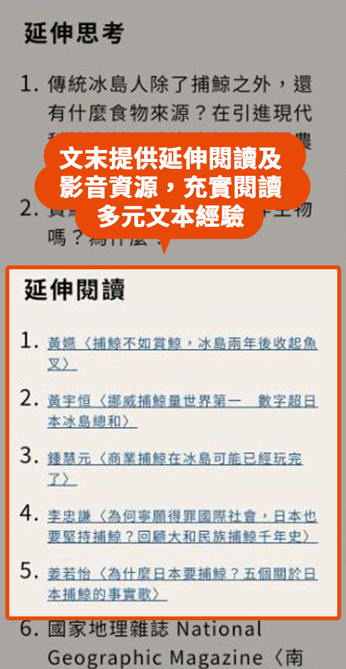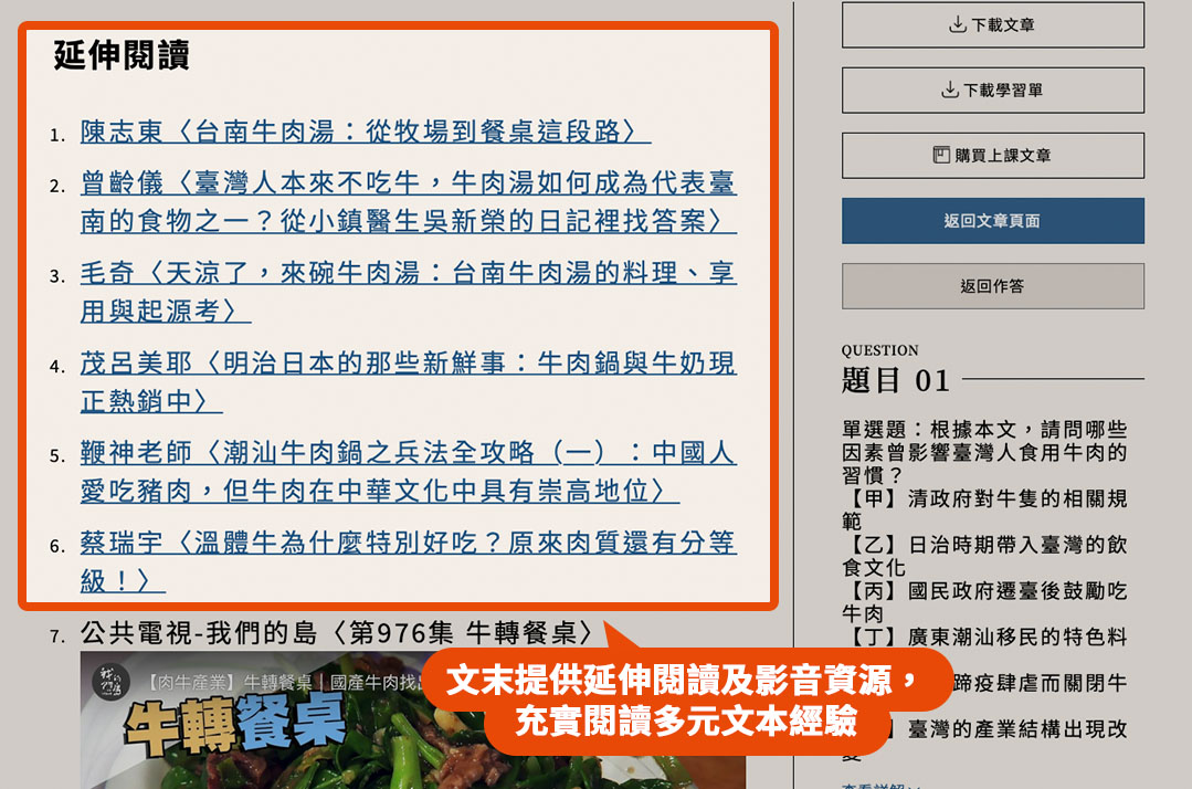 目前數位平臺上有超過千篇的跨領域文章,其中還包含了「議題融入擴充閱讀文章」「素養題及線上作答系統」、「文本分析與詳解」、「數位學習歷程記錄」,以及豐富的「延伸文章及影片」內容。訂購期間,可隨選隨看,無限次閱讀數位擴充內容。
