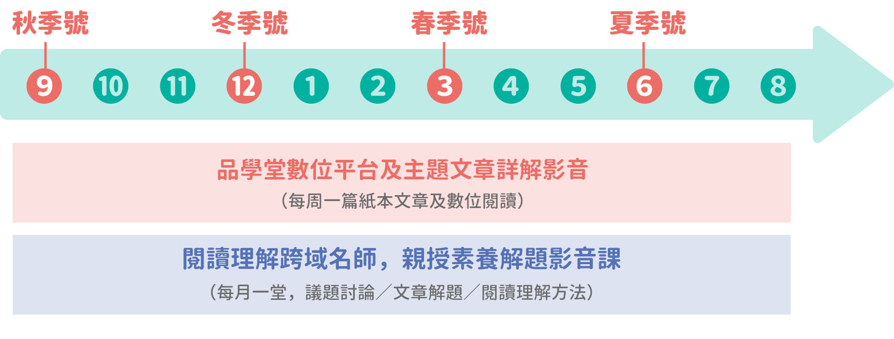 雜誌與數位平臺提供5-8年級 中小銜接關鍵準備,規劃符合孩子的學習量及時間,以每季1本《閱讀理解junior》紙本刊物,搭配數位服務的雙素養閱讀,接軌未來五年閱讀教育政策。於9/12/3/6 四個月份出刊。