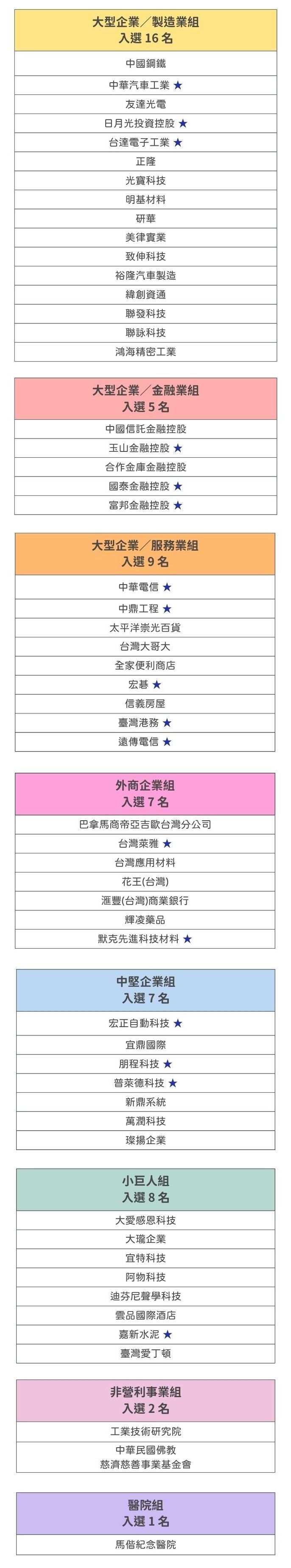各組別入選企業名單依筆畫排序,標註星號者為連續兩年入選。