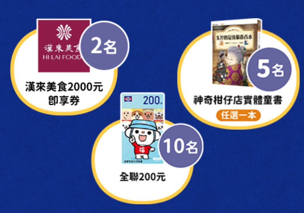 ◎為響應環保,除了實體書籍獎品外,以下獎項皆為電子票券形式:漢來美食2000元即享券、全聯200元電子禮卡、7-11超商100元即享券。(電子票券將會寄送到您帳號的email中)