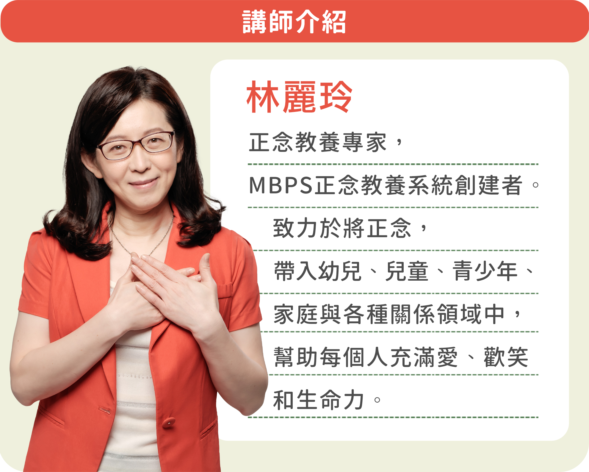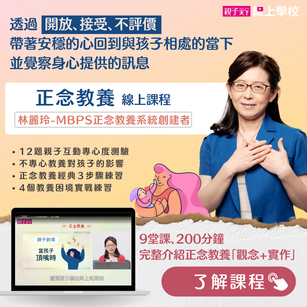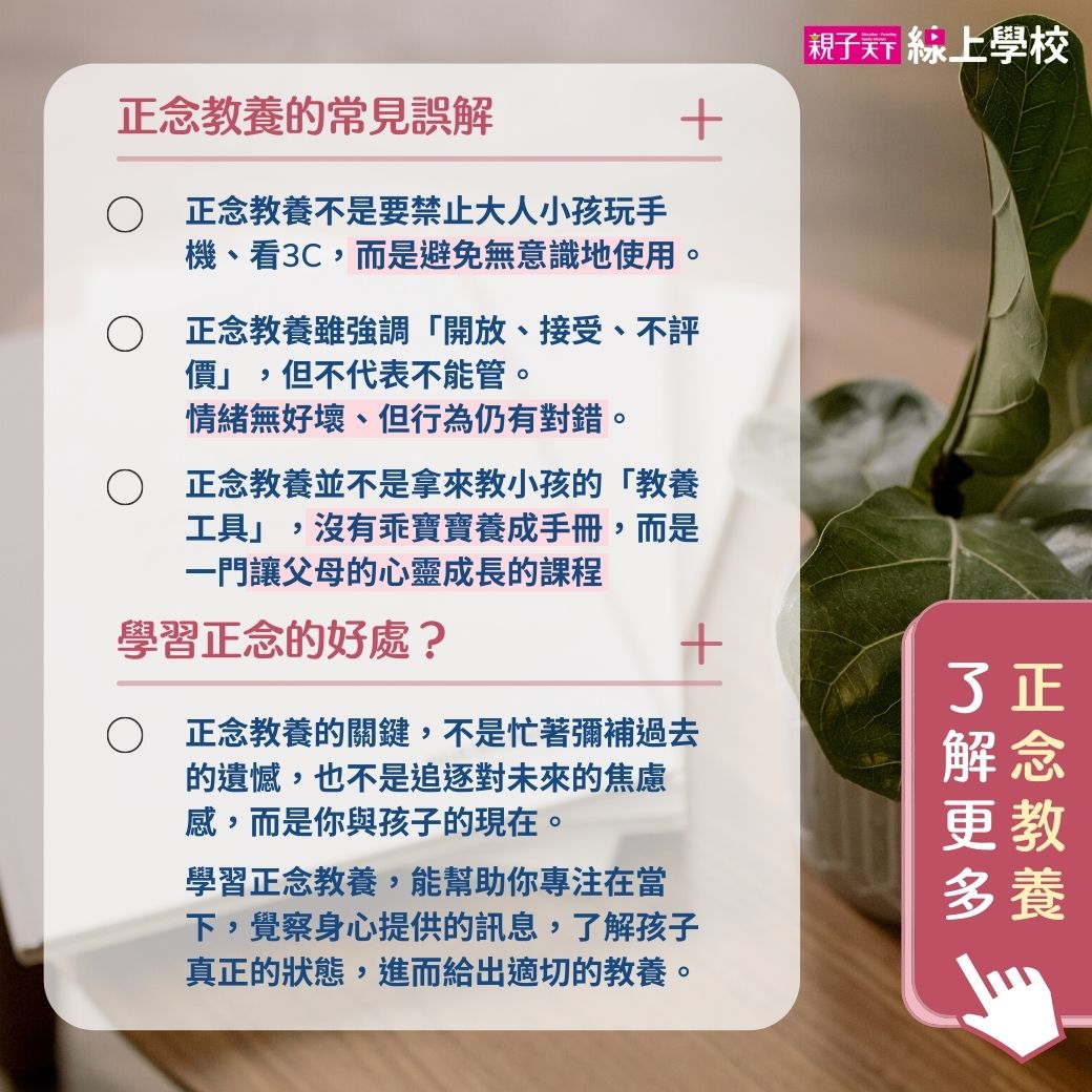 「正念教養」並不是拿來教小孩的「教養工具」,沒有乖寶寶養成手冊,而是一門讓父母的心靈成長的課程。