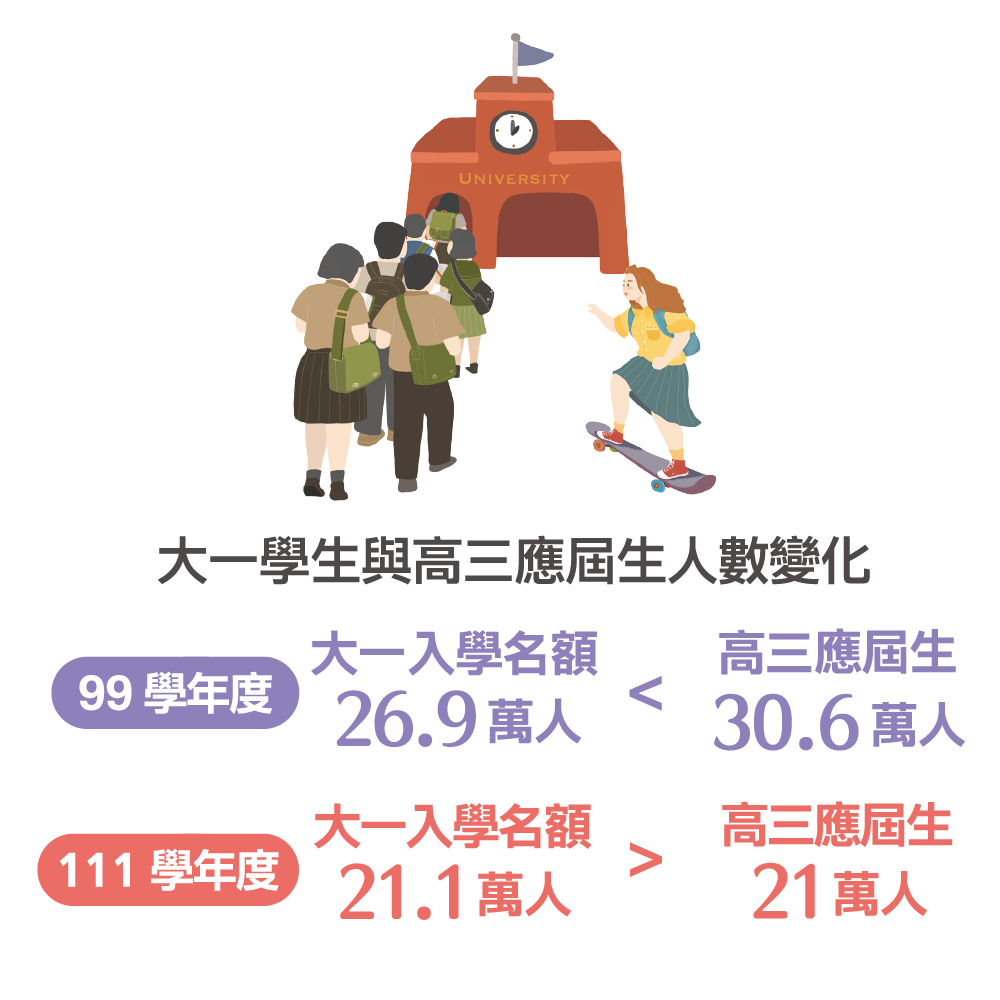 111學年度的大一新生入學名額,已超過上一學年度高三學生人數,呈現「供過於求」狀態。