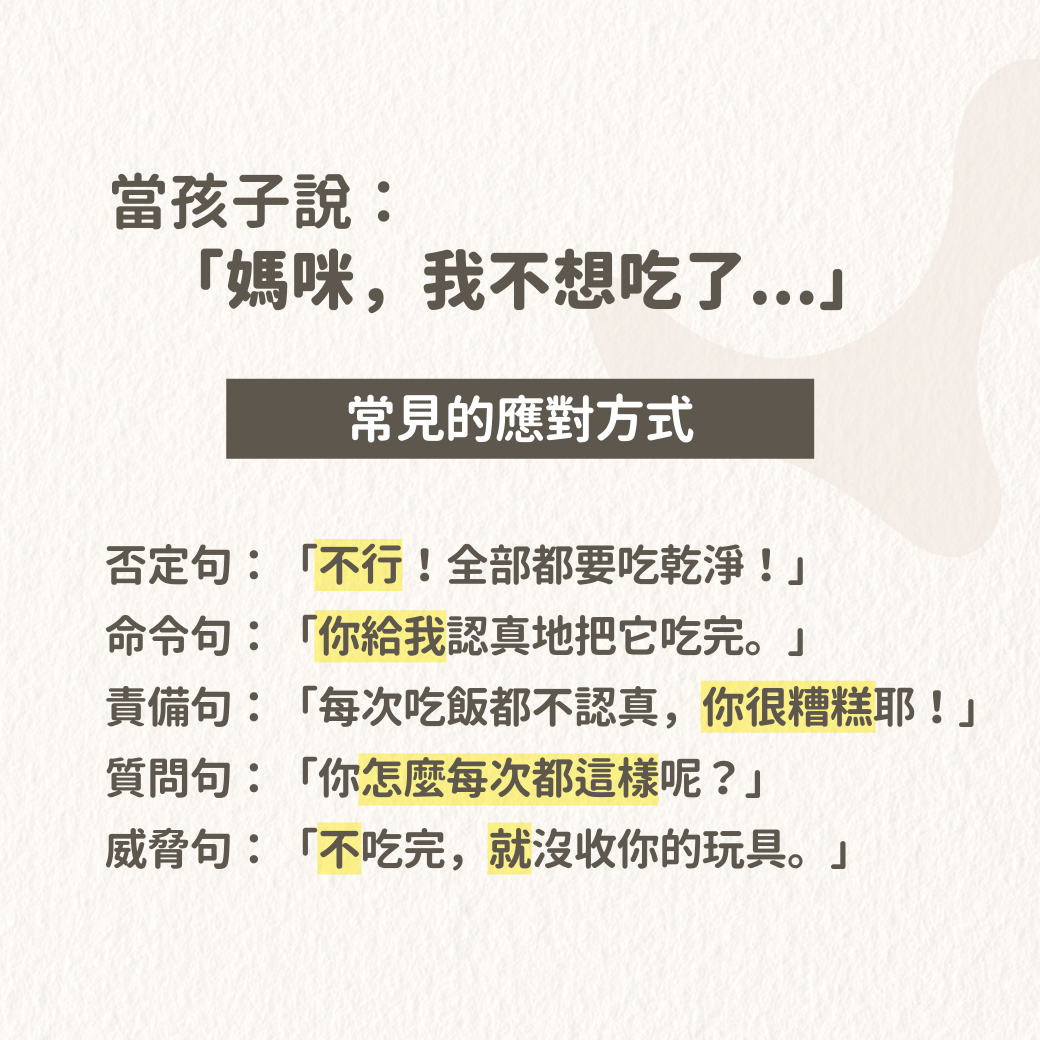 家長往往感到生氣與不耐煩,也許是累了一整天,想早早休息;也許是辛苦準備了一頓飯卻不被捧場的失落?這時「負向語言」就會不經意地伴隨情緒脫口而出...