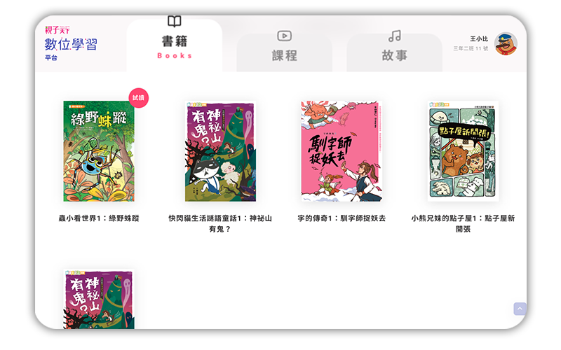 專為兒童打造的全新電子書閱讀平臺,根據「適讀年級、學習領域、學習主題」進行分類,針對1~3年級,精選100本親子天下出版的各式主題童書,讓老師可以快速地找到最適合班上學生的書籍,節省大量時間和精力。