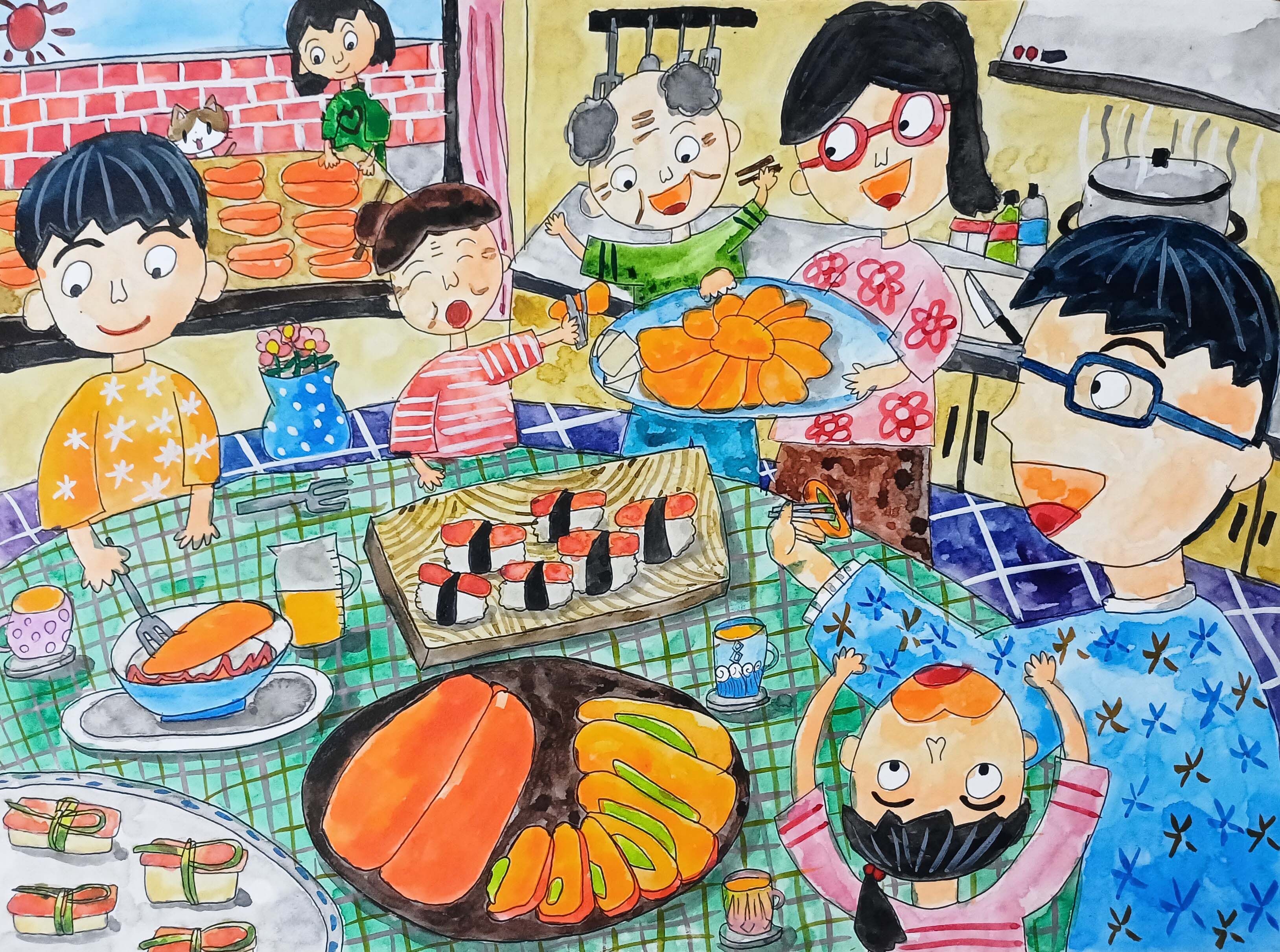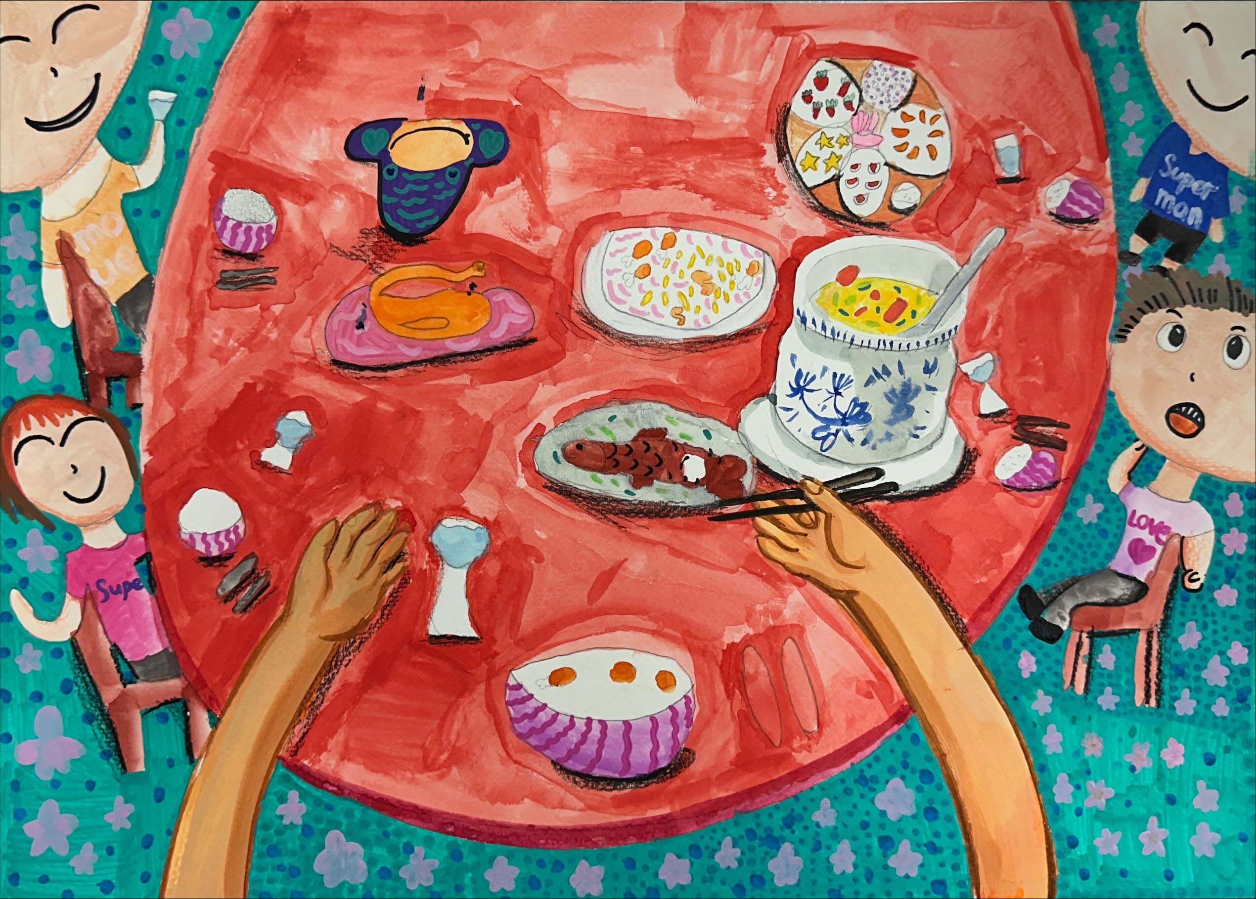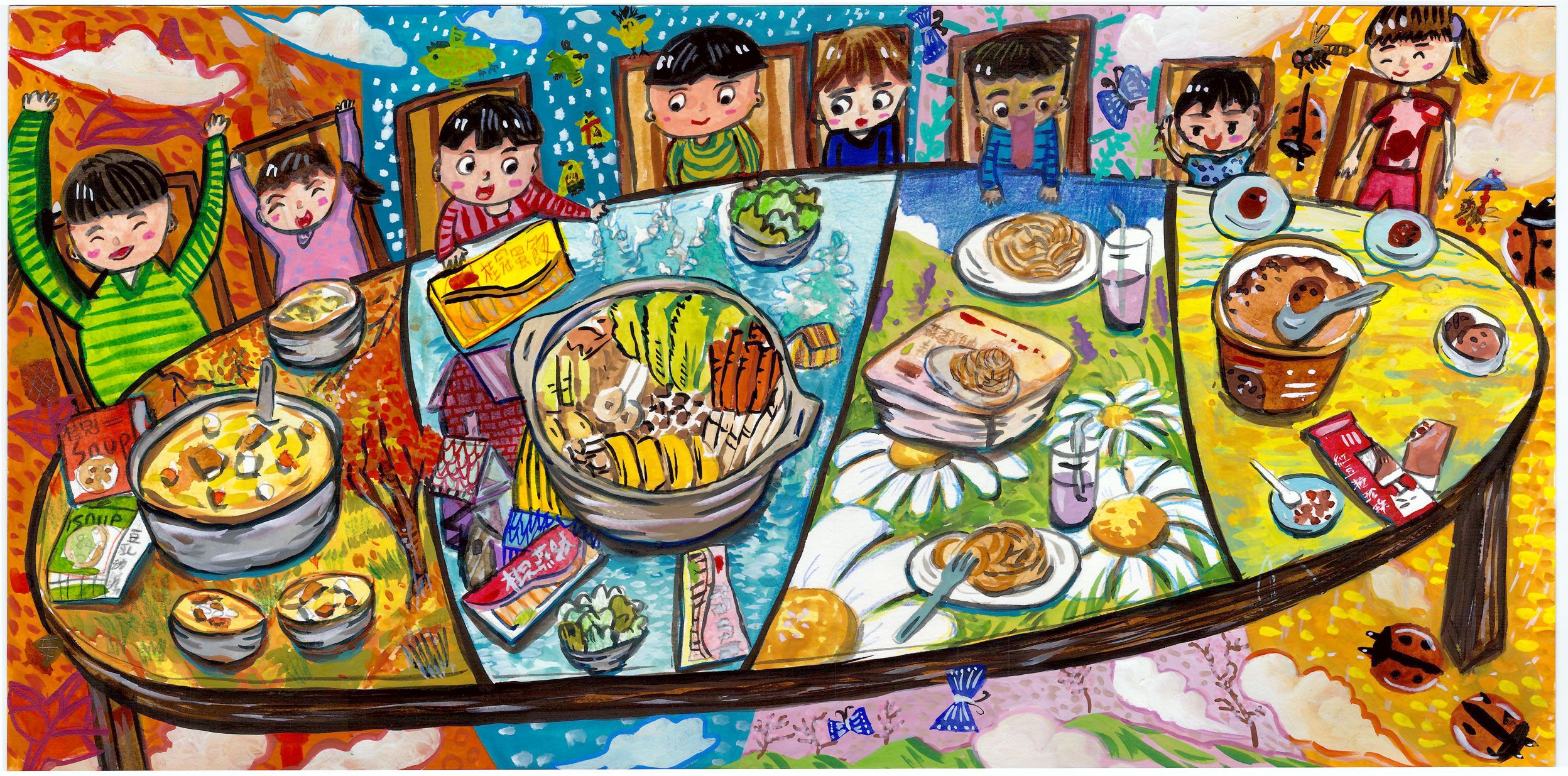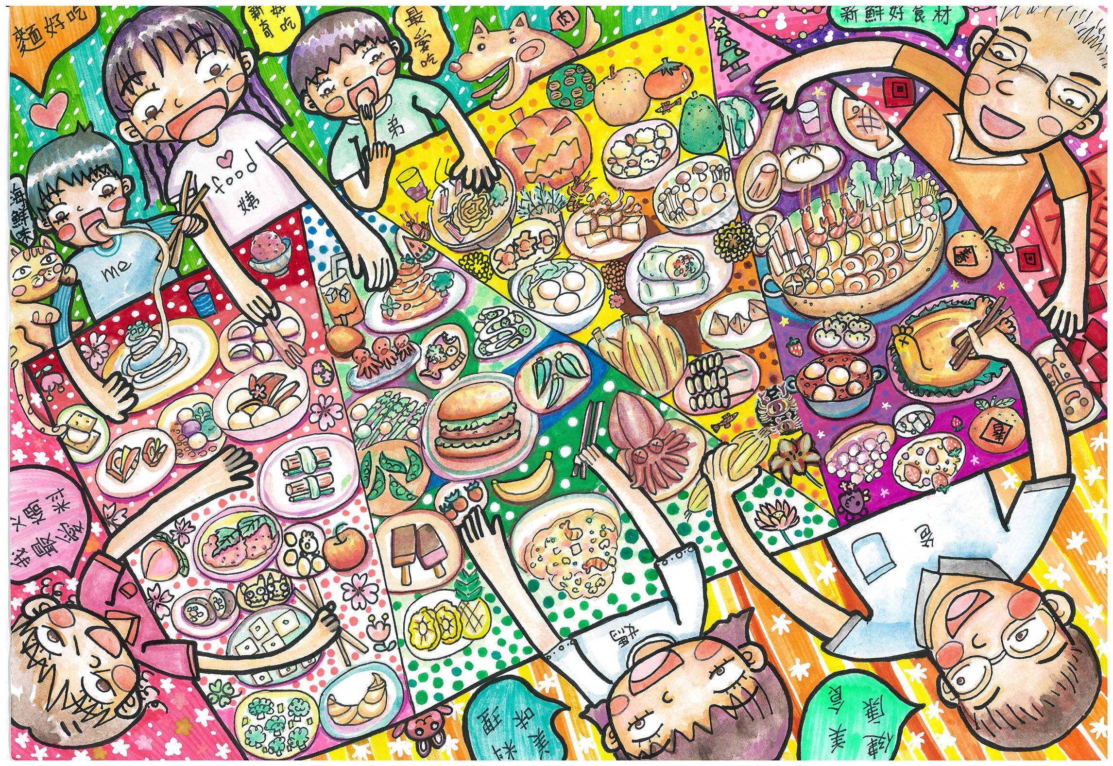 創作理念我家的晚餐大拼盤。 要餵飽七個人真不簡單!阿公阿嬤像螞蟻辛苦的張羅食物,櫻花盛開的春天,以簡單爽口的菜餚為主;海邊玩耍的夏天,用海水藍和綠草為主色,展現冰涼感;賞橘、吃海鮮的秋天,以黃、橘當主色,畫出暖心的食物;聖誕節和過年的冬天,放入火鍋、紅豆湯圓,呈現喜慶的心情。我們天天吃的新鮮、吃的爽快,滿滿的幸福感包圍我。 想對家人說的話阿嬤妳煮飯好吃謝謝阿嬤,阿姨我愛你。 阿公感謝你讓我們有晚餐吃,弟弟趕快來吃飯! 媽媽謝謝你的照顧。 爸爸謝謝你認真賺錢。 |