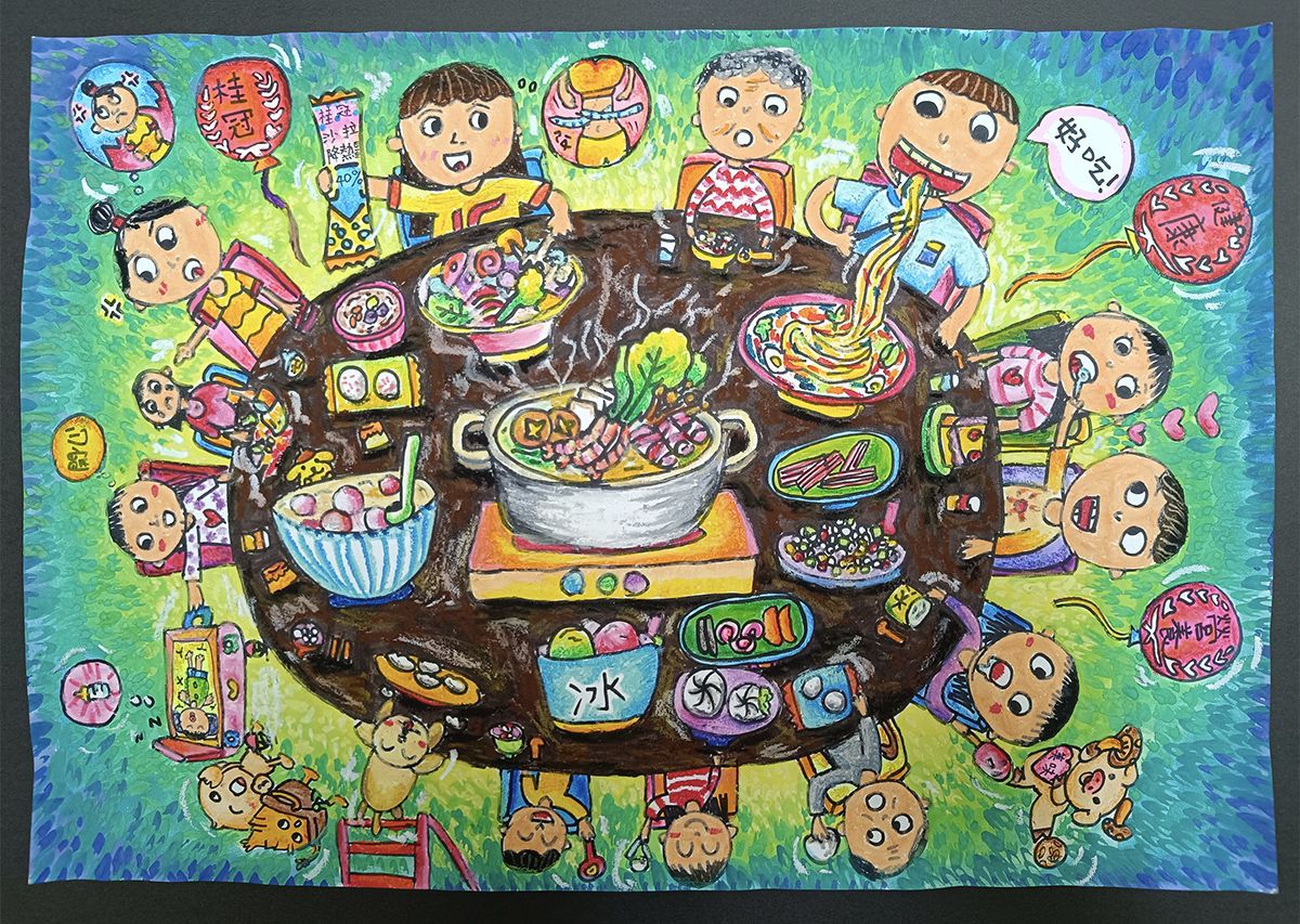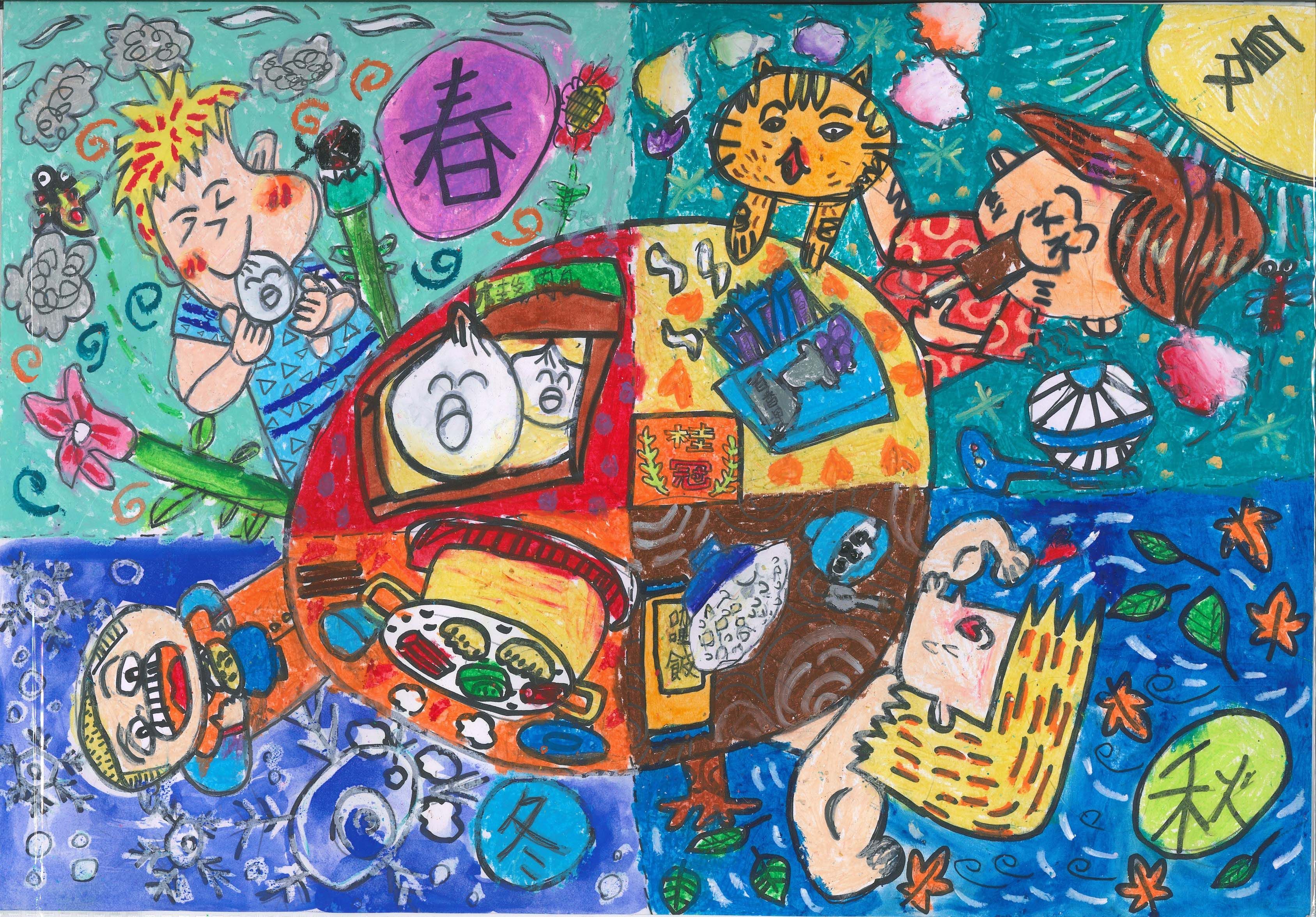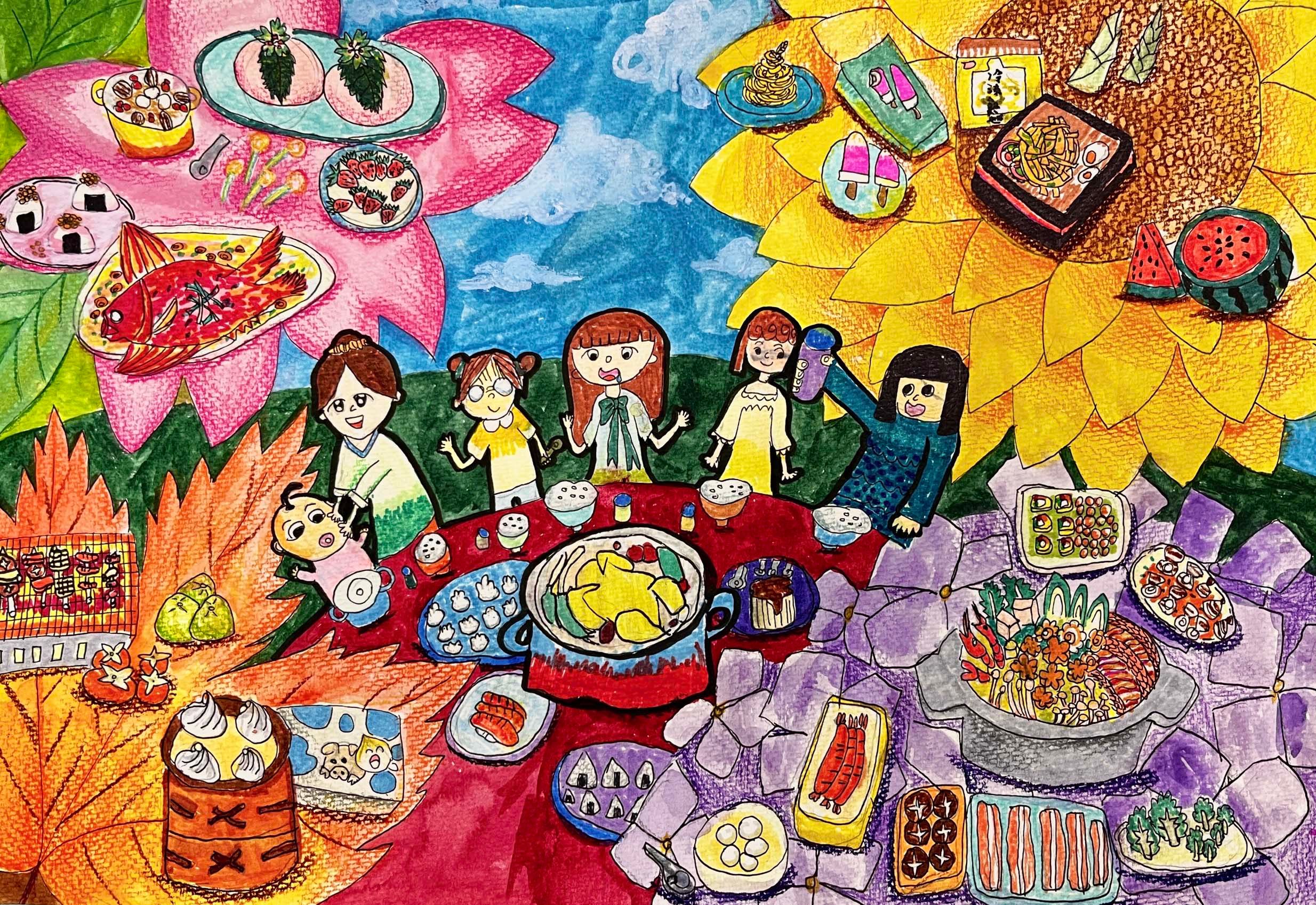 創作理念我家的晚餐大拼盤。 要餵飽七個人真不簡單!阿公阿嬤像螞蟻辛苦的張羅食物,櫻花盛開的春天,以簡單爽口的菜餚為主;海邊玩耍的夏天,用海水藍和綠草為主色,展現冰涼感;賞橘、吃海鮮的秋天,以黃、橘當主色,畫出暖心的食物;聖誕節和過年的冬天,放入火鍋、紅豆湯圓,呈現喜慶的心情。我們天天吃的新鮮、吃的爽快,滿滿的幸福感包圍我。 想對家人說的話阿嬤妳煮飯好吃謝謝阿嬤,阿姨我愛你。 阿公感謝你讓我們有晚餐吃,弟弟趕快來吃飯! 媽媽謝謝你的照顧。 爸爸謝謝你認真賺錢。 |