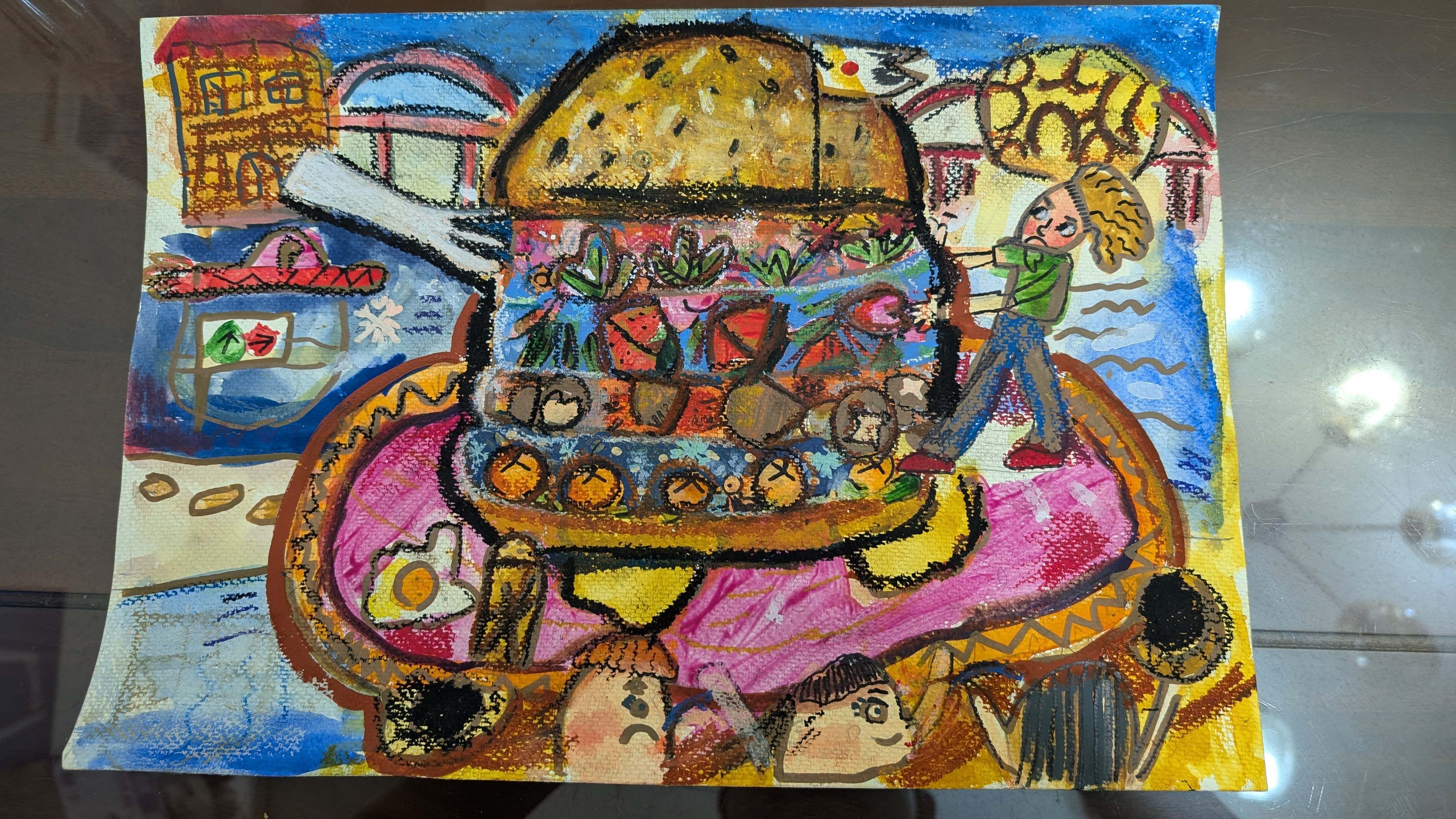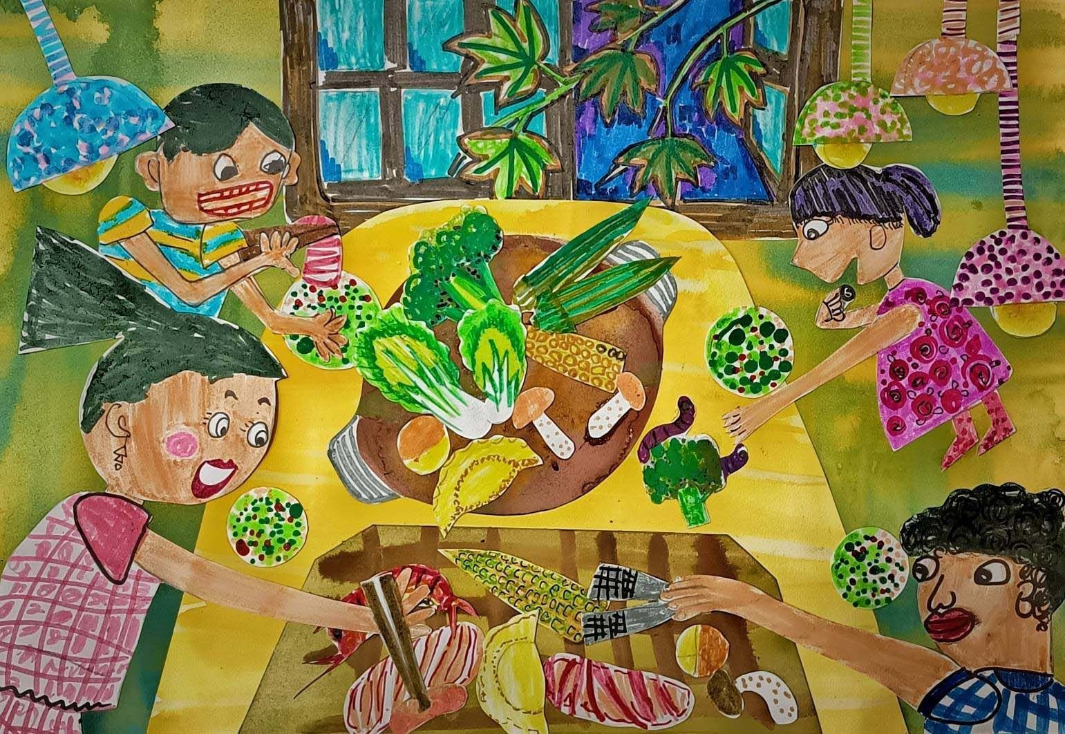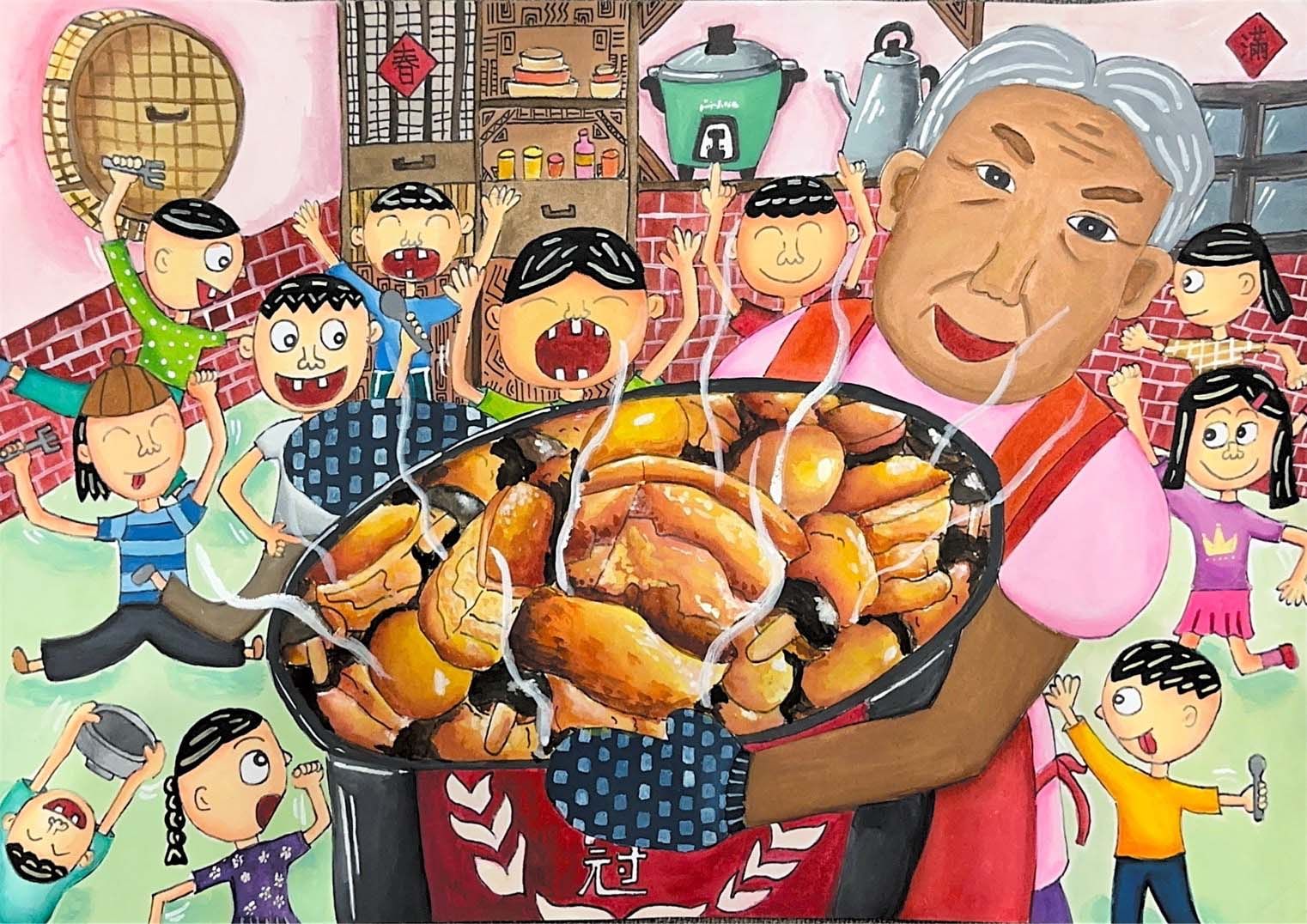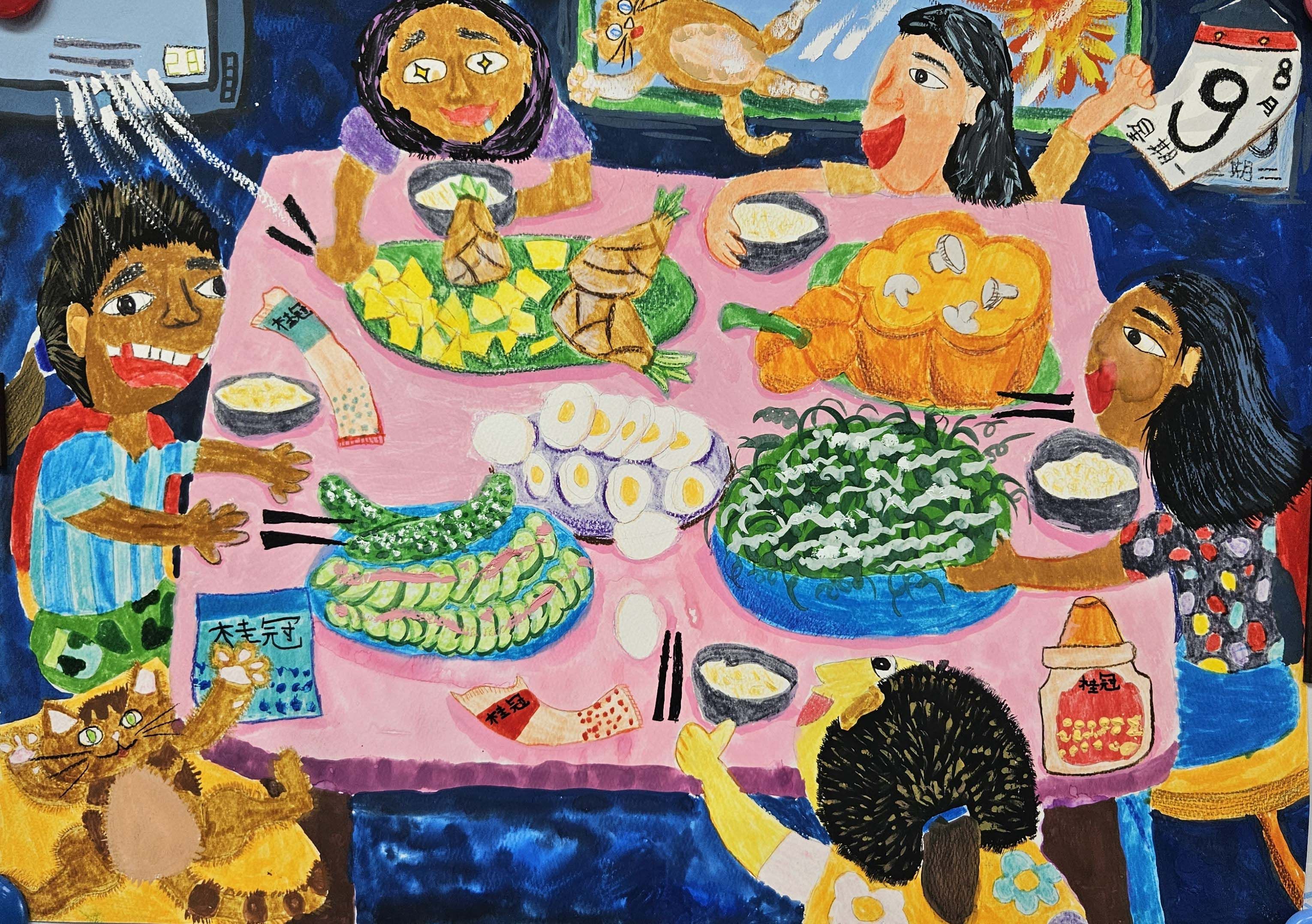 創作理念我家的晚餐大拼盤。 要餵飽七個人真不簡單!阿公阿嬤像螞蟻辛苦的張羅食物,櫻花盛開的春天,以簡單爽口的菜餚為主;海邊玩耍的夏天,用海水藍和綠草為主色,展現冰涼感;賞橘、吃海鮮的秋天,以黃、橘當主色,畫出暖心的食物;聖誕節和過年的冬天,放入火鍋、紅豆湯圓,呈現喜慶的心情。我們天天吃的新鮮、吃的爽快,滿滿的幸福感包圍我。 想對家人說的話阿嬤妳煮飯好吃謝謝阿嬤,阿姨我愛你。 阿公感謝你讓我們有晚餐吃,弟弟趕快來吃飯! 媽媽謝謝你的照顧。 爸爸謝謝你認真賺錢。 |