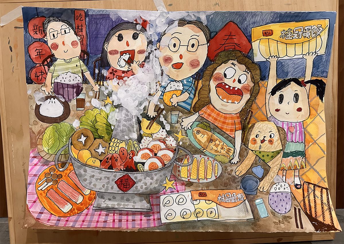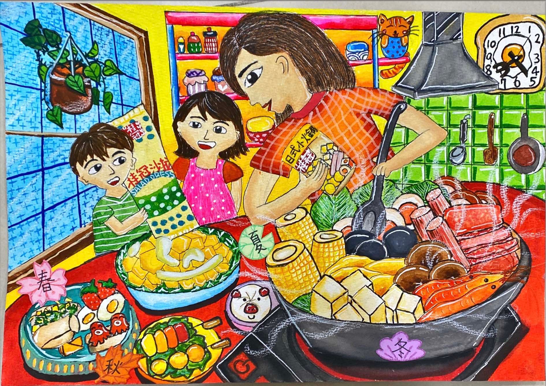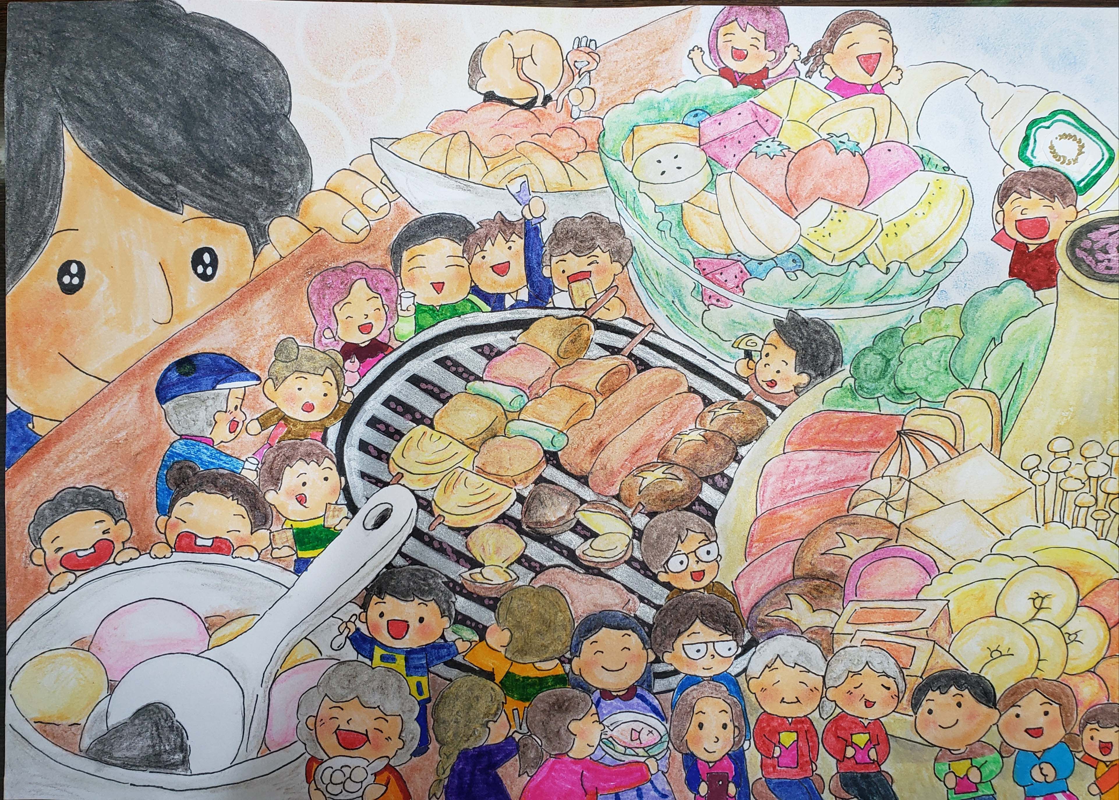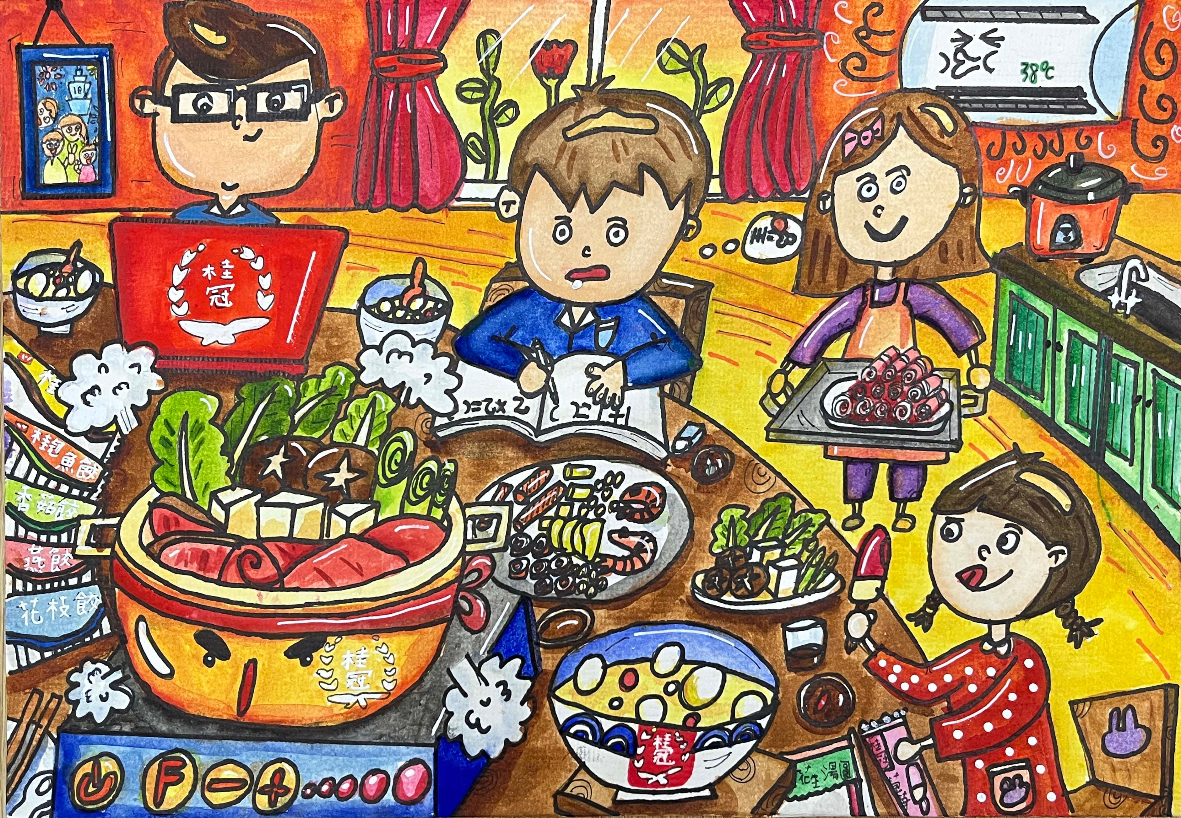 創作理念秋涼涼,家暖暖。窗外的楓葉由綠漸橘,秋天悄悄地來了。這天是秋天的晚上,全家人圍爐吃火鍋燒烤熱騰騰的煙讓我在秋葉感覺很溫暖。食材中有秋天盛產的秋葵、玉米筍、白菜,以及一年四季都吃得到的香菇和青花菜,會動的青花菜蟲讓我又驚訝又開心,讓我好想要養牠;還有我最喜歡吃的松阪豬、蝦子和火鍋必備的桂冠火鍋料,我很開心。 想對家人說的話我和媽媽一起到超商買火鍋燒烤食材,認識到很多當季的蔬菜;和家人一起吃到喜歡的食物,爸爸媽媽妹妹還有我都好滿足好開心,謝謝我的家人,讓餐桌上充滿溫暖和歡樂的氣氛。 |