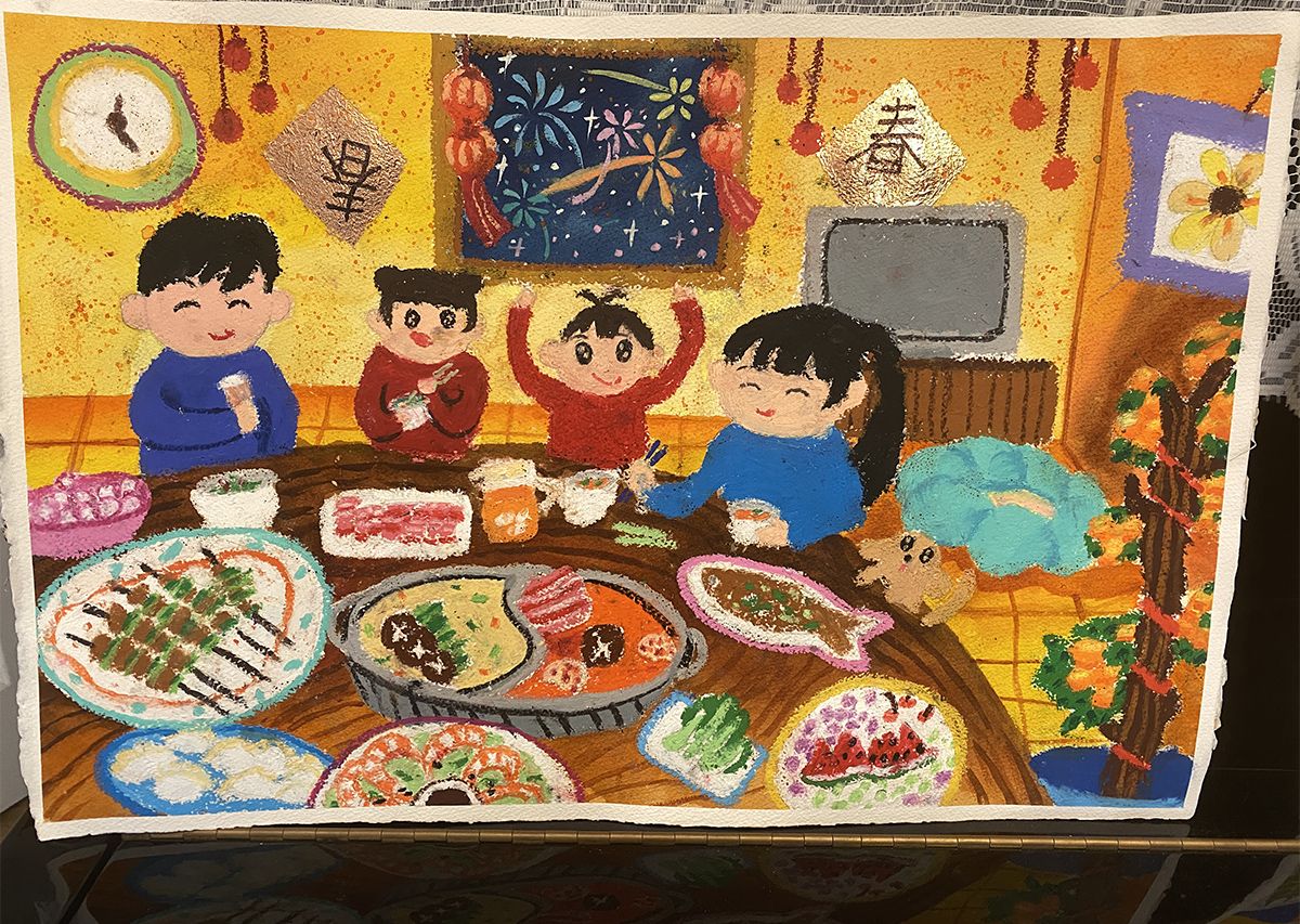 快樂的年夜飯,因為我很喜歡跟家人一起邊吃飯邊看煙火,我畫了很多菜。我最喜歡湯圓、火鍋、水果拼盤。