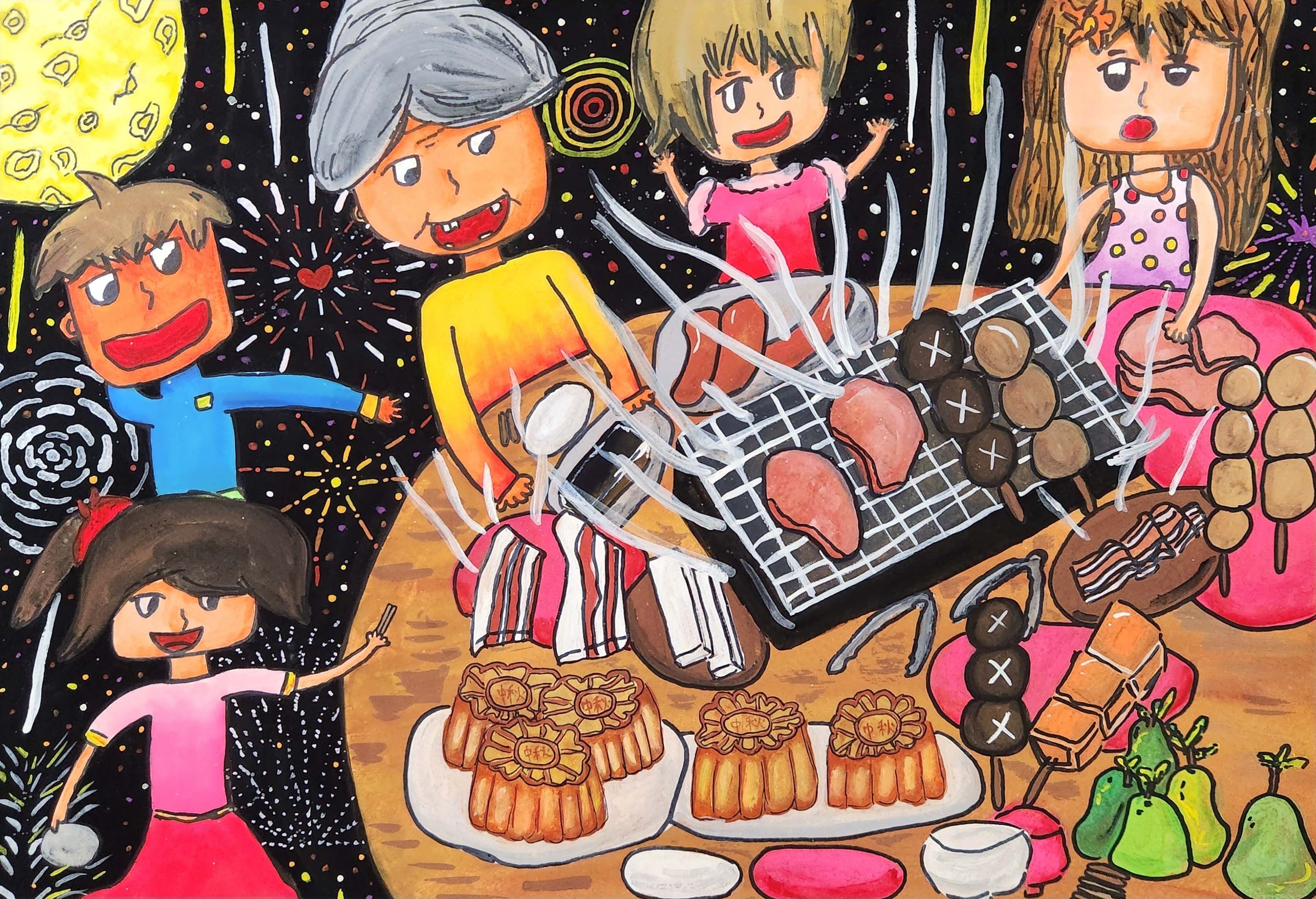 創作理念中秋烤肉團圓樂 我和爸爸媽媽妹妹從台南回苗栗外婆家過中秋節,秋天的餐桌上擺滿了好多香甜的柚子,外婆也特別準備豐富美味的烤肉食材,還有親友贈送的月餅。我們和外婆一起聊天烤肉賞月吃東西,還有放煙火,中秋節的夜晚全家人一起團聚,好開心的回憶,所以想要把這份美好的感動畫下來。 想對家人說的話感謝外婆辛勤採買和花很多時間處理好烤肉食材;看到柚子就聯想到秋天來臨,馬上就要過中秋節了,桌上的月餅,也代表親朋好友的中秋祝福。圖畫中餐桌上的美食總代表外婆和家人滿滿的愛和祝福,想說:謝謝您們,我也愛你們。 |