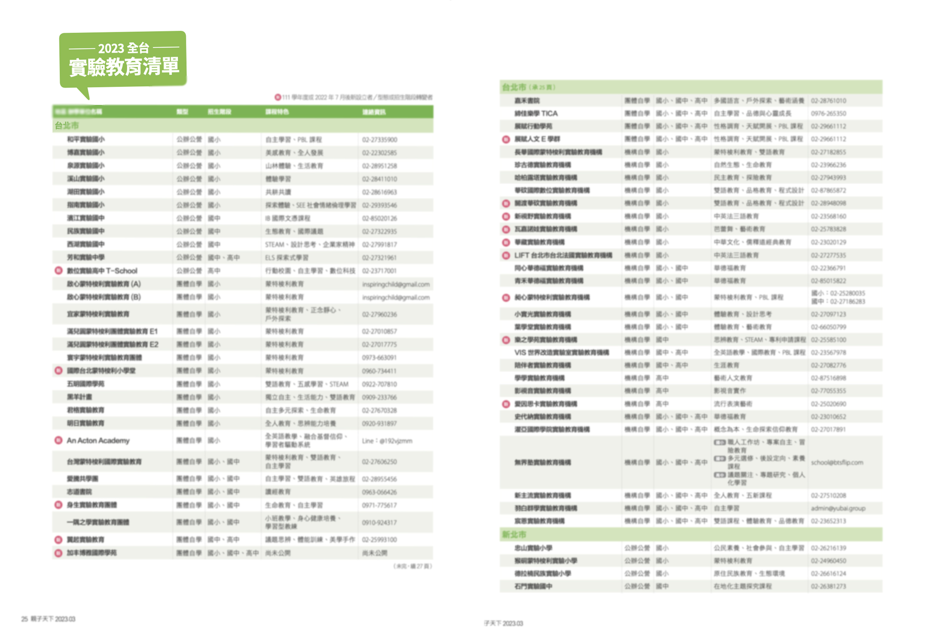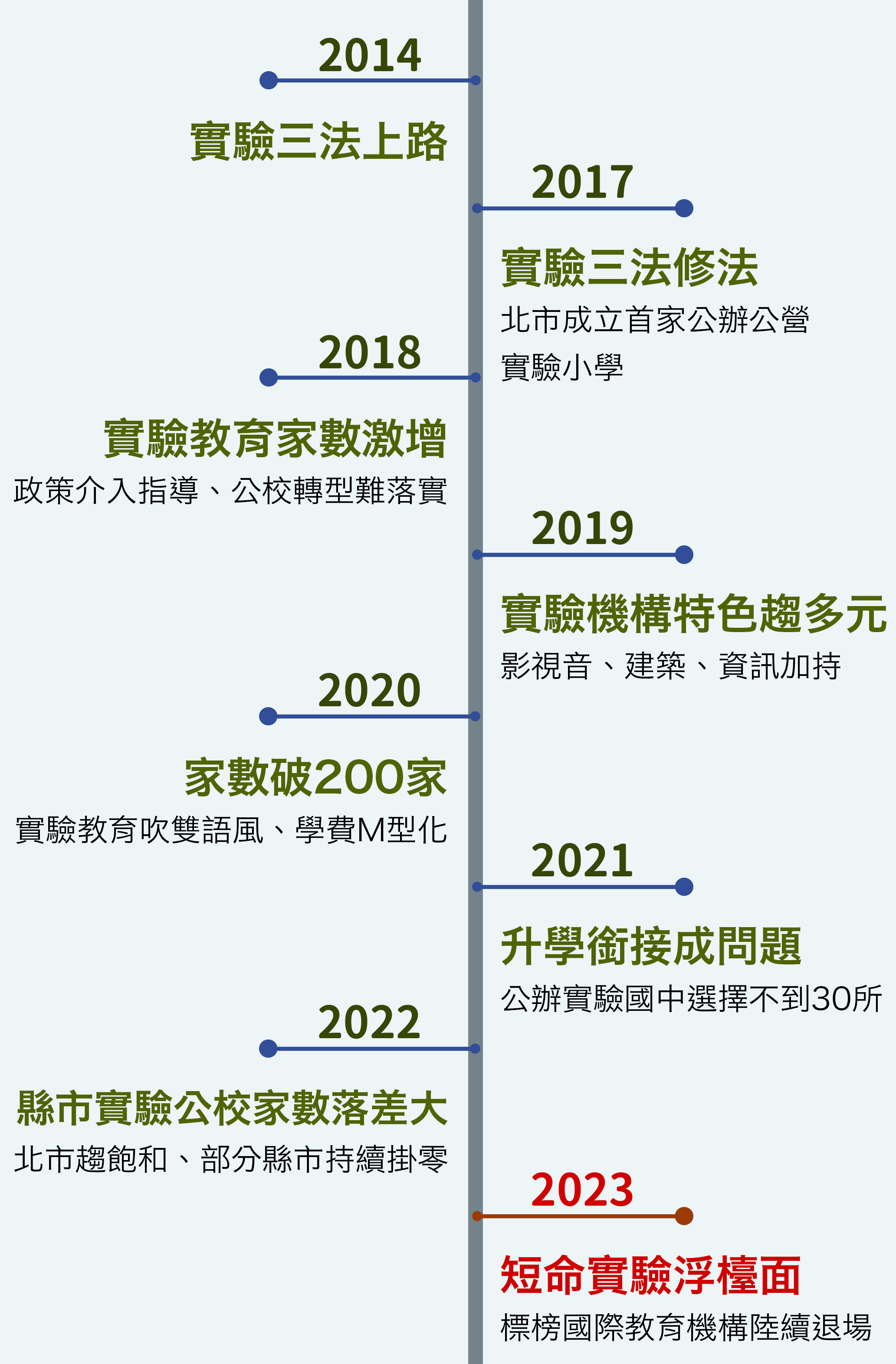 《親子天下》自二〇一七年起,每年進行全台實驗教育調查。實驗教育成長愈趨穩定、課程更添豐富多元,或提供虛實混成方式、芭蕾舞、表演藝術、專利申請等課程。也見實驗教育退場,或因財務問題關門大吉,或公立國小因理念難維繫,自實驗教育重返體制內教學。