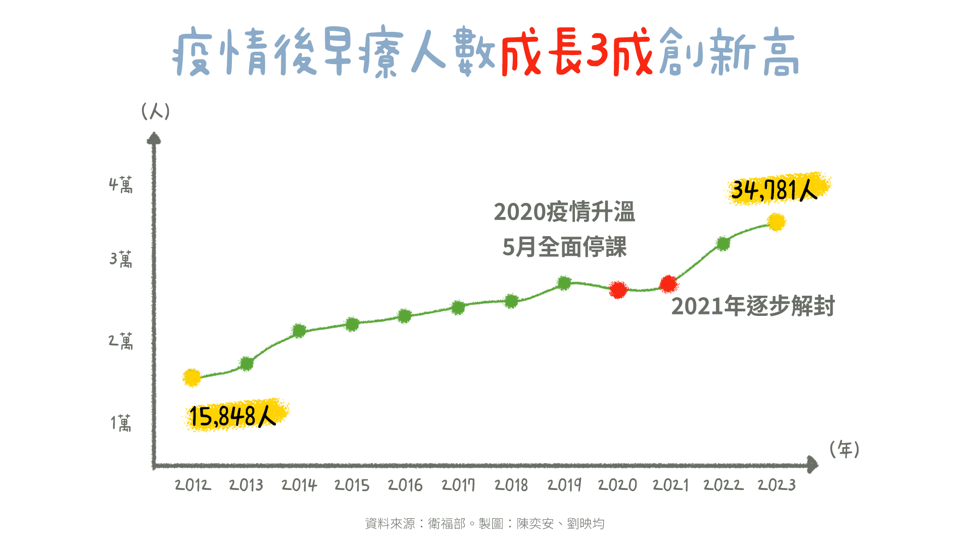 全台0-6歲兒童早期療育通報人數逐年增加、12年成長2倍;受到2020新冠疫情影響,2022年史上通報人數成長最快,2023創下新高。