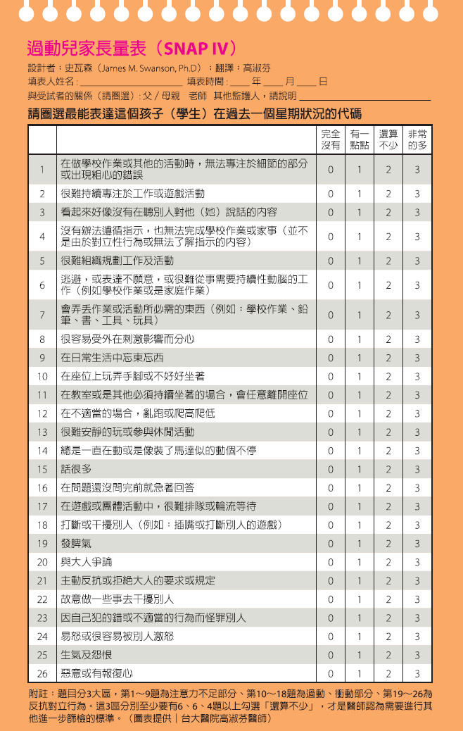 如何辨別專注力不足/過動症(ADHD)呢?家長可參考以下檢測表,作出初步的觀察。但要注意,ADHD不是簡單就能判斷的,以下檢測表只是初步觀察,無法取代醫師的診斷,建議爸爸媽媽們帶孩子至大醫院兒心科(兒童心智科)求診,做完整的評估。