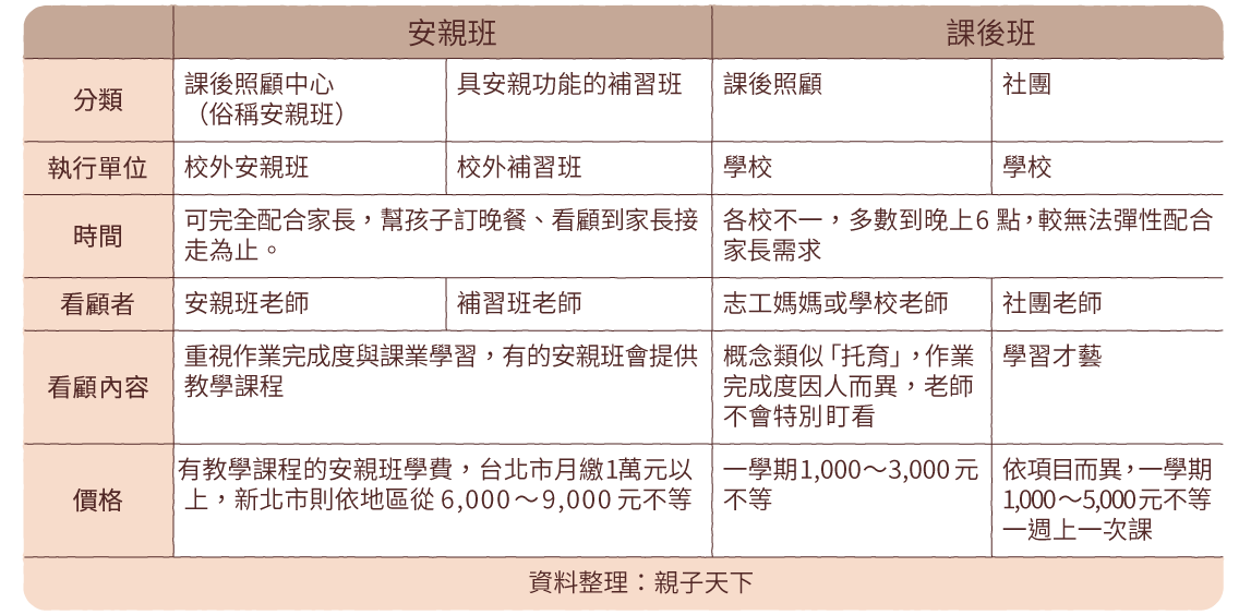 ·課後照顧:通常由學校老師或志工媽媽看顧,或外包給校外團體,多是自行寫作業,沒有安排其他活動,功課完成度因人而異。校內課後照顧班通常一學期費用為1,000~3,000元不等,因各校規定不同而異