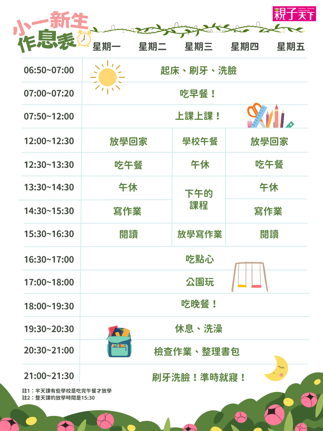 升上小一後,每天要面對的第一個改變就是「上學時間」,小學的上學時間會比幼兒園更早,大多規定7點50分之前到校,因此,儘早養成早睡早起的習慣,就是適應小學生活的第一步!