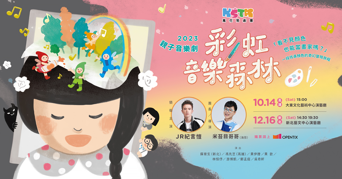 「看不見顏色也能當畫家嗎?」由知名親子台「米苔目哥哥」黃韋翔所領軍的萬花筒劇團,打造全台首創色盲題材的親子輕音樂劇《彩虹音樂森林》,述說一位色盲女孩勇敢追夢的暖心故事,2017~2018巡演佳評如潮,在2023真情改版、重磅升級,邀請型男暖爸 JR紀言愷 首部領銜主演,舞台與服裝皆獨具巧思,十首歌曲聽見有顏色的聲音,整齣戲寓教於樂,很適合大小朋友共賞,將於12月16日新北藝文中心演藝廳真情獻演!歡迎大家走進劇場,觀賞優質好戲,聆聽動人樂章。